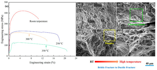 The mechanical properties (a) and fracture morphology characteristics (b) of the Al-3Ce-0.8Ca-1.9Mn alloy at room temperature and elevated temperatures.