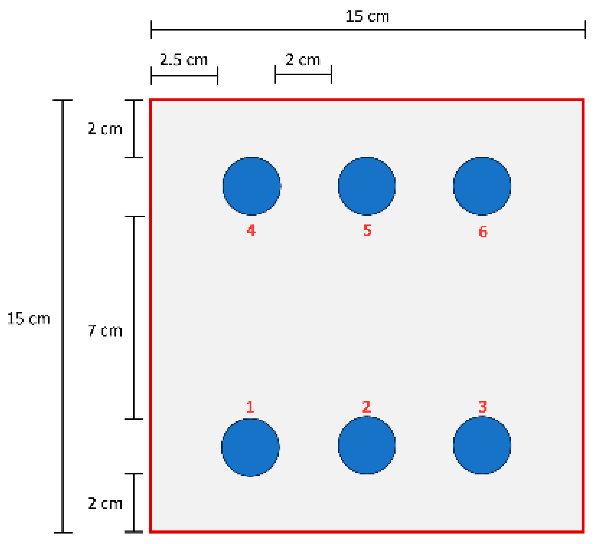 A two-component water-based epoxy primer (Daw Caparol Italia, Vermezzo, Italy) was used. Component A was a zinc phosphate pigmented epoxy; component B was a polyamide curing agent. The primer was applied by airless spray to two polyurethane (PUR) sandwich panels (3000 × 1000 mm) with hot-dip galvanized steel facings and an 80 μm core thickness. One panel was left as received (unsanded); the other was sanded prior to coating. Before spraying, external galvanized surfaces were cleaned; for the sanded panel, cleaning followed sanding. Coated panels were cured in an oven at 60 °C for 1 h. Target dry film thickness (DFT) was 80 µm. Samples for tests were extracted from the two panels. Each test panel was referenced to a simple local grid. Measurement positions are labelled 1–6 and refer to general areas of the panel: Position 1 = bottom left, Position 2 = bottom center, Position 3 = bottom right, Position 4 = top left, Position 5 = top center, and Position 6 = lefttop righ. For pull-off, pencil-hardness, and cross-cut tests, measurements were taken at each labelled position (typically replicated), and means ± standard deviations are reported in the corresponding section. A summary of the sampling position is reported in the scheme in Figure 1.