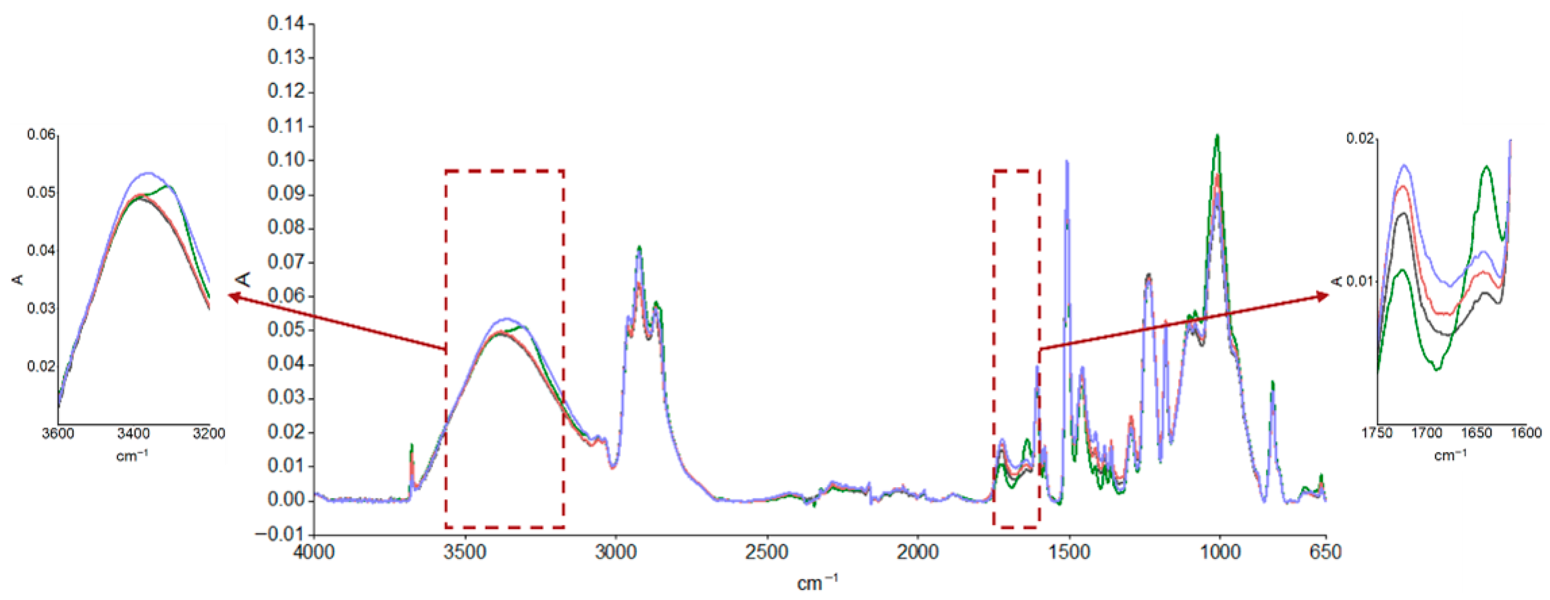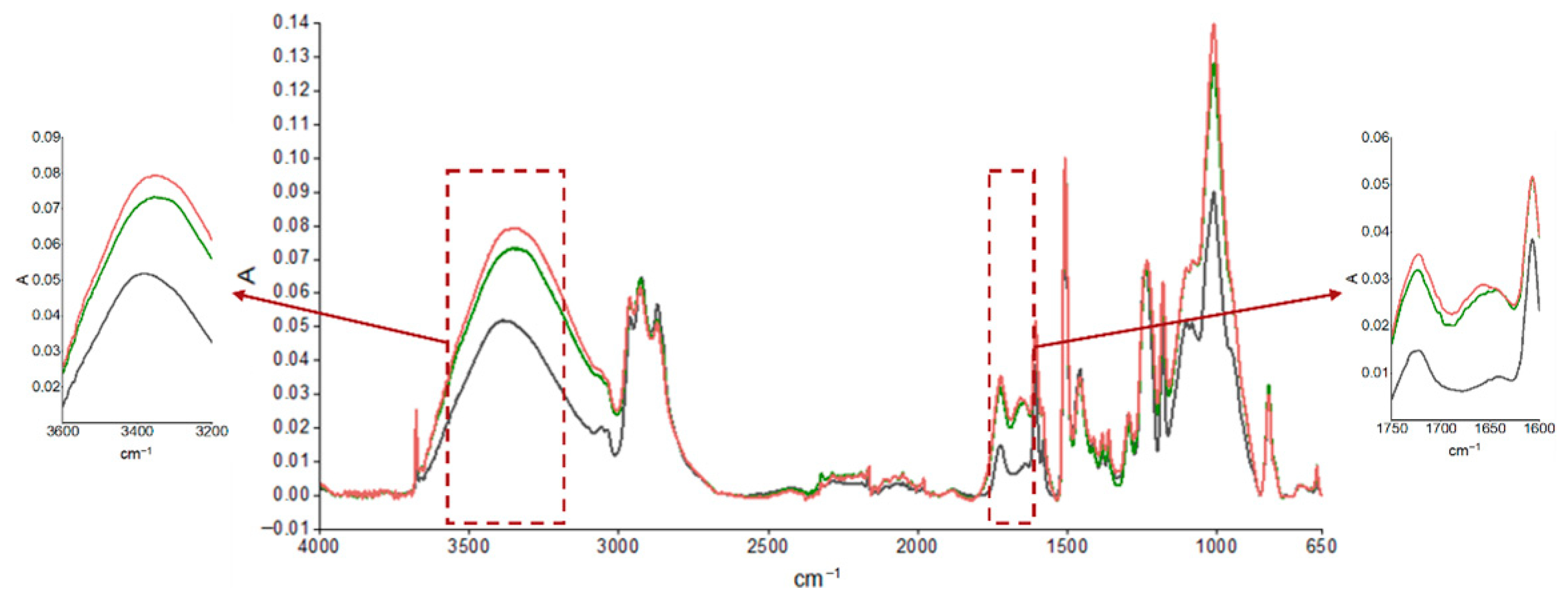 Compared with typical DGEBA spectra, the analyzed primer shows increased intensity in the hydroxyl region (3600–3200 cm−1) and new peaks in the carbonyl region (1750–1600 cm−1). These differences are consistent with post-application cross-linking, possible moisture uptake during transport/storage, and partial oxidation. A small peak near 3670 cm−1 is attributed to O–H stretching of filler-related species [21,22]. No significant spectral differences between sanded and unsanded panels were observed.