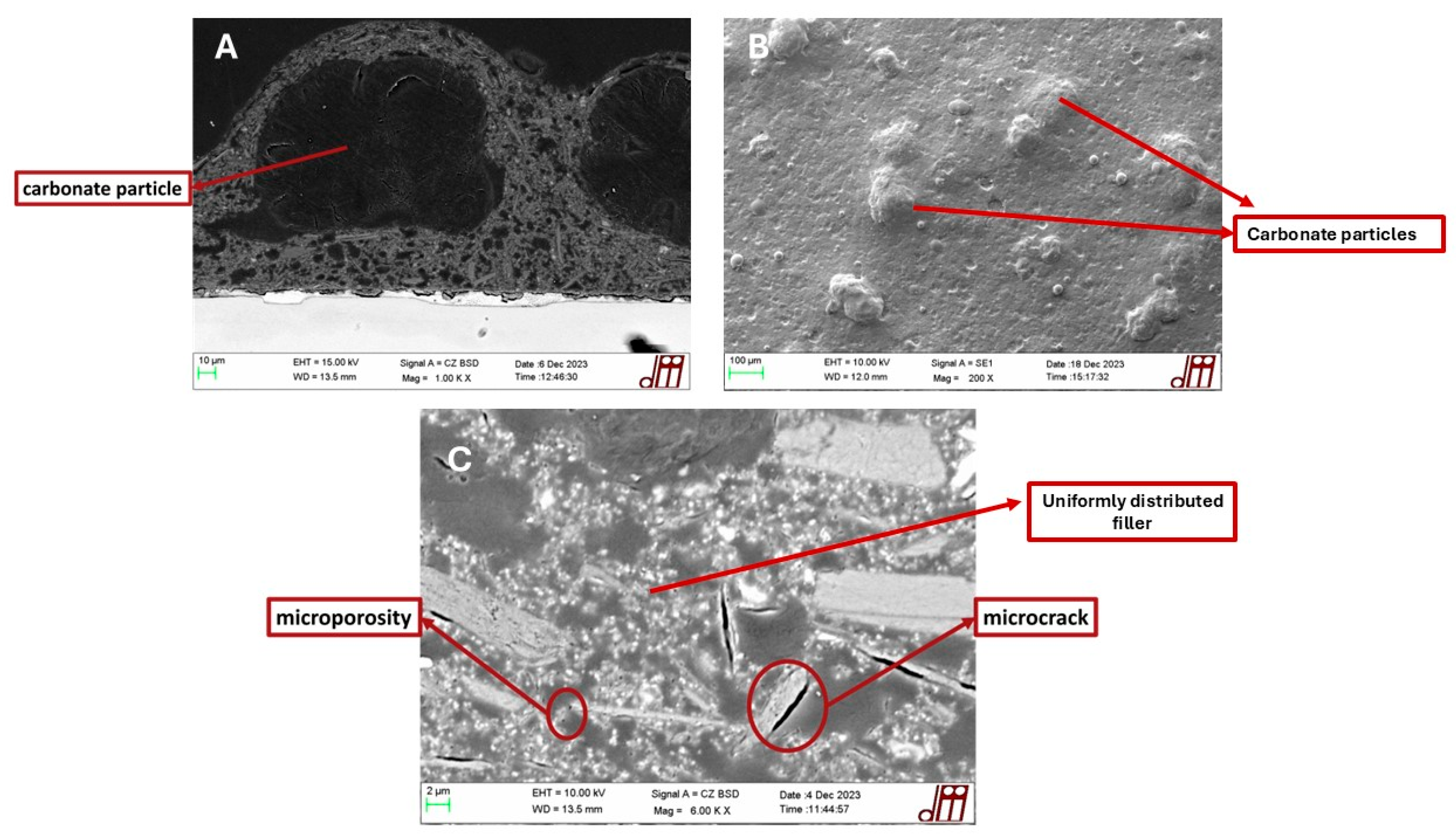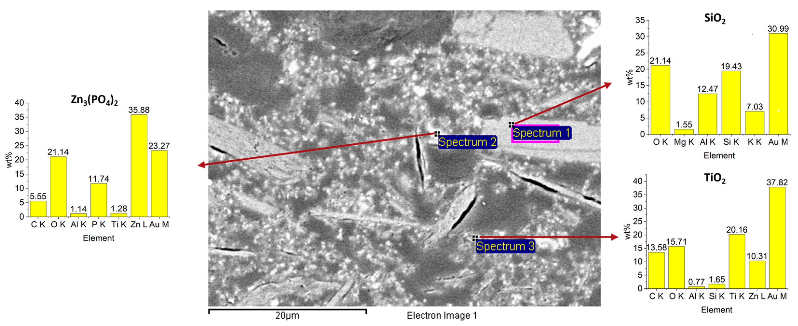 SEM surface and cross-section images (Figure 5 and Figure 6) reveal microporosity (consistent with FT-IR water uptake), carbonate particles, microcracks (likely from curing or polishing), and various filler morphologies. In sanded samples (Figure 6A), the resin adapts to groove profiles, which may enhance mechanical interlocking, though some interfacial regions were damaged during polishing (Figure 6B). Thermal cycling increased cross-sectional crack density relative to unaged samples, while surface cracks were not visible after hot/cold aging. EDS spectra confirm the presence of silica (elongated fillers), zinc phosphate, and titanium dioxide (spherical particles) (Figure 7).