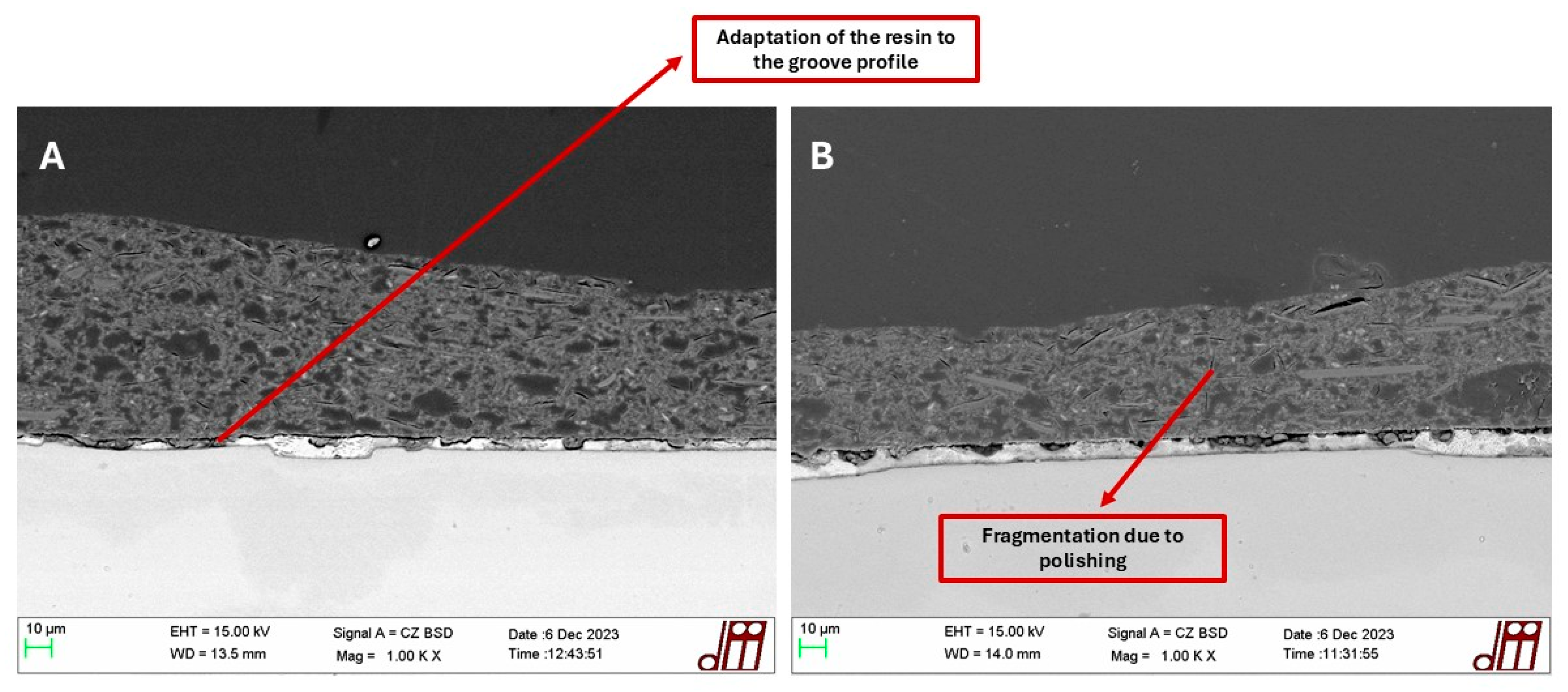 Cross-section thickness measurements show an average DFT of 99 µm (unsanded panel) and 63 µm (sanded panel). The observed difference in coating thickness between sanded and unsanded samples—99 µm versus 63 µm on average—was initially attributed to operator variability. However, further analysis suggests that surface roughness introduced by sanding may have influenced the wetting behavior and flow dynamics of the resin during application. The increased surface energy and microtopography of the sanded substrate could have led to partial resin absorption into surface grooves, reducing effective film build-up. Additionally, the presence of larger carbonate particles in the formulation may have contributed to localized thickness variations, especially in areas where filler accumulation occurred. These factors highlight the need for a more controlled application process and possibly a rheological adjustment of the resin to ensure uniform coverage across different surface preparations. Therefore, an appropriate calibration of the application technique is expected in the future as a way to guarantee the achievement of the desired thicknesses. Furthermore, a pronounced lack of homogeneity in the primer thickness was found, mostly due to the irregular distribution of carbonates of different sizes within the resin, probably added to facilitate the adhesion of a subsequent UV-protective layer.