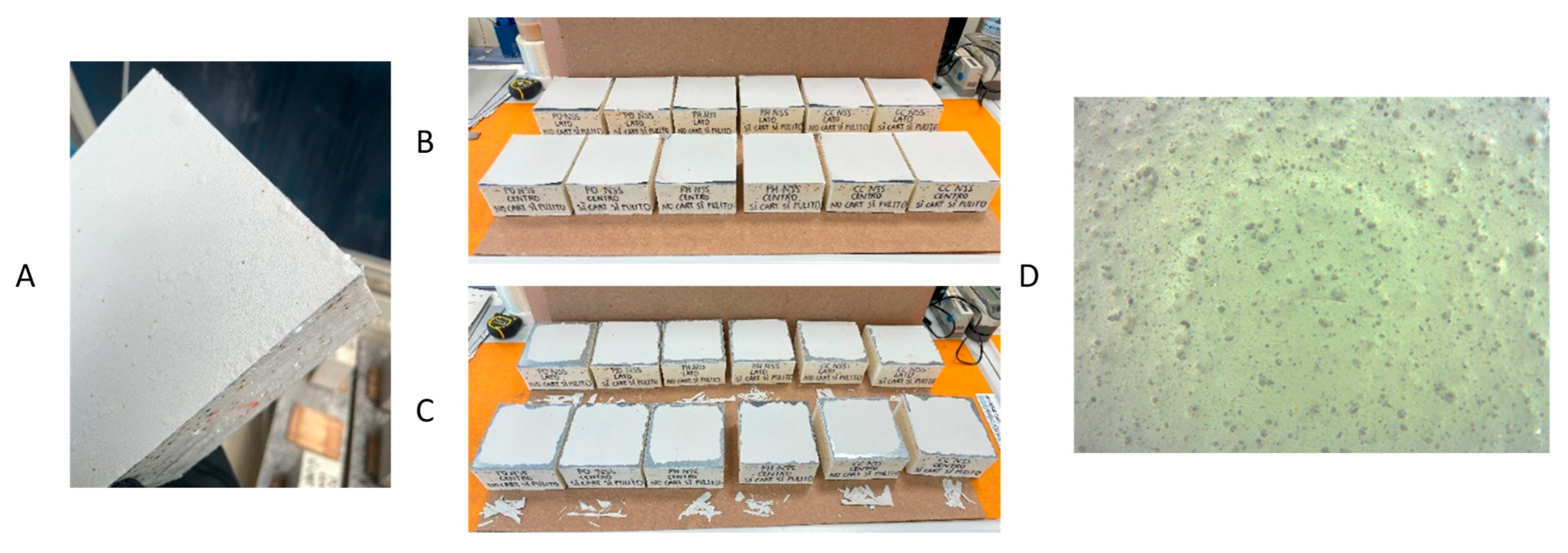 Pull-off adhesion tests were performed with a digital apparatus (model 58-C0215, Controls S.p.a., Liscate (MI), Italy) following ISO 4624 [18] using 20 mm dollies; six measurements were made on each specimen. Cross-cut tests followed ISO 2409 [19] and were performed at three positions per sample with a multi-blade spacing selected for the measured thickness range (75–125 µm). Pencil-hardness tests were conducted according to relevant standards (reported in Section 3).