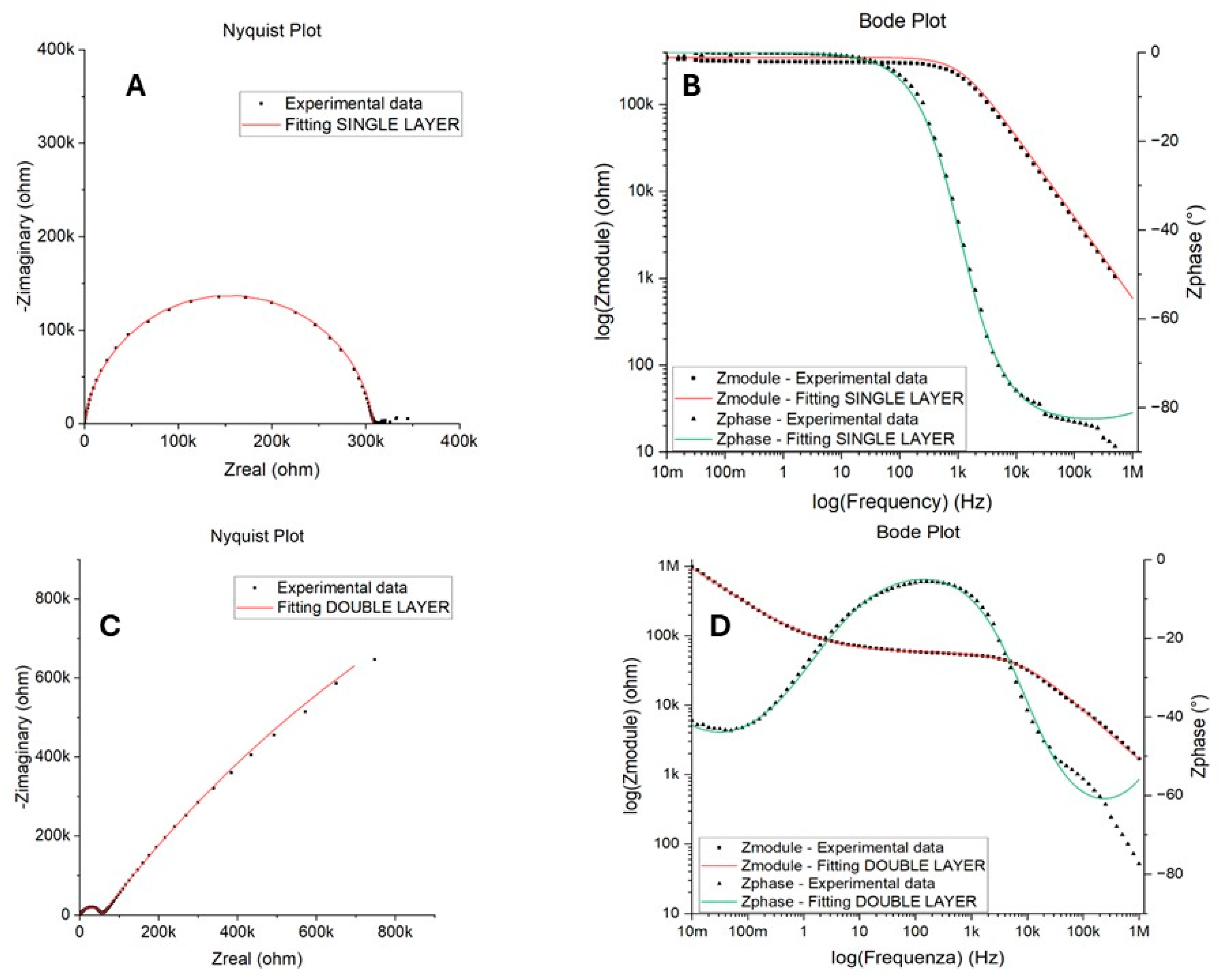where Rt is the total resistance to polarization, given by the resistance of the coating Rp for the SINGLE LAYER model and by the sum of the resistance of the pores Rpore and the charge transfer resistance Rct in the case of the DOUBLE LAYER [27].
