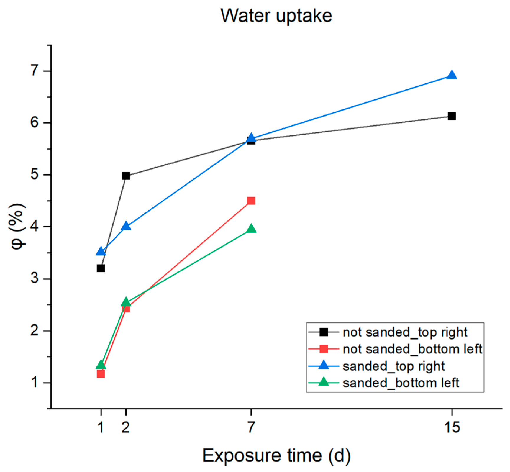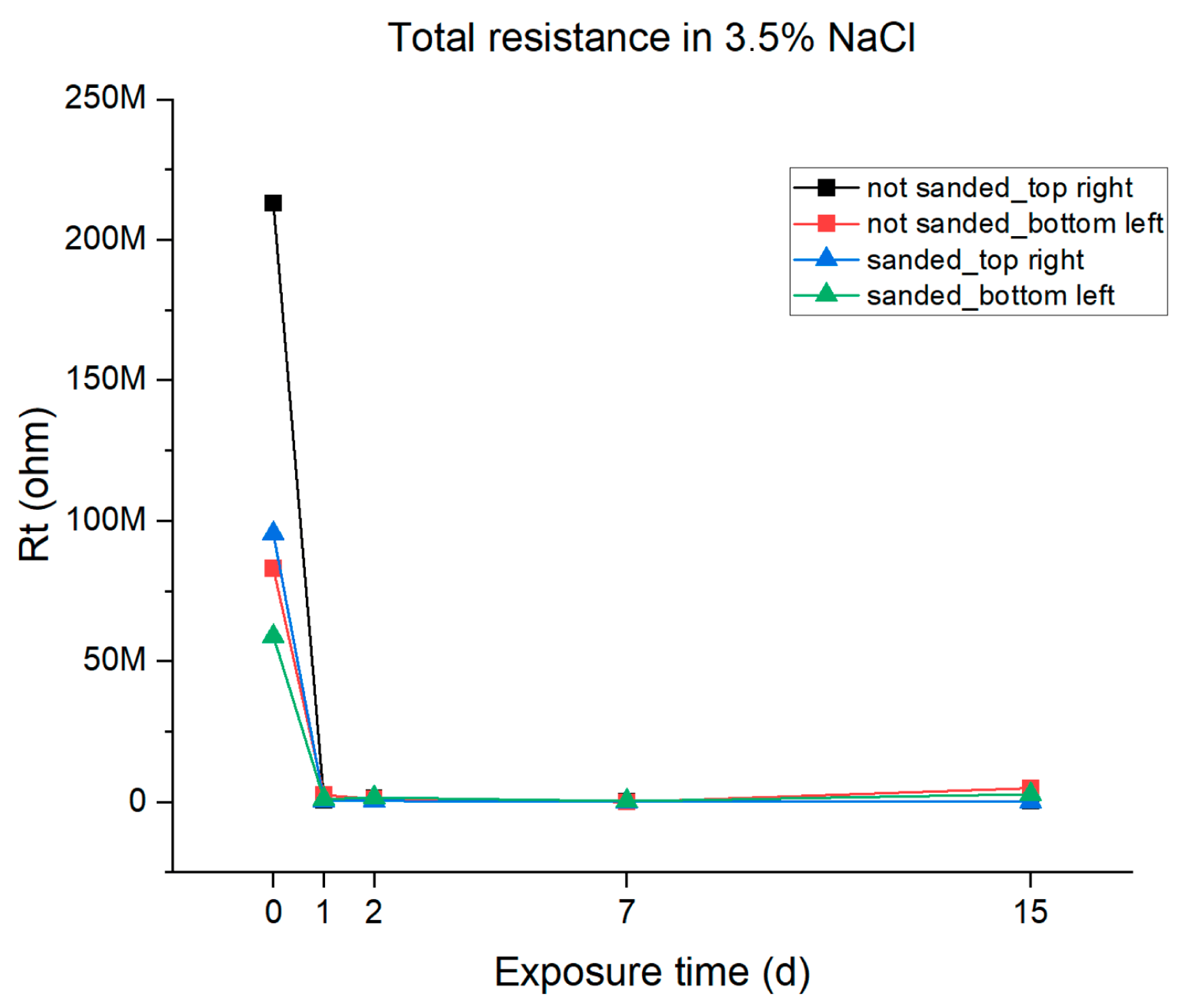 From the data reported in Table 4, the total polarization resistance given by the coating was calculated and then plotted vs. the immersion time. The results are reported in Figure 11. It can be observed that the resistance of the resin shows a significant initial decrease after one day of immersion. This variation is attributable to the absorption of water. After this decrease, the trend after the first day of immersion is constant resistance until 7 days of immersion, indicating good barrier properties of the coating and another slight increase in the last 7 days of immersion, probably due to active protection given by zinc. Considering the differences between the different samples, there are no significant differences in the polarization resistance between the sanded and the unsanded samples whereas some differences can be noted regarding the sampling position. The bottom-left sanded and unsanded samples show an increase in the Rt after 7 days of immersion, probably due to water penetrating the substrate and the active protection given by the zinc (and due to this fact, the Bode plots evidence two time constants for these samples as shown in Figure 9D), but this was not observed in the samples in the top right position.