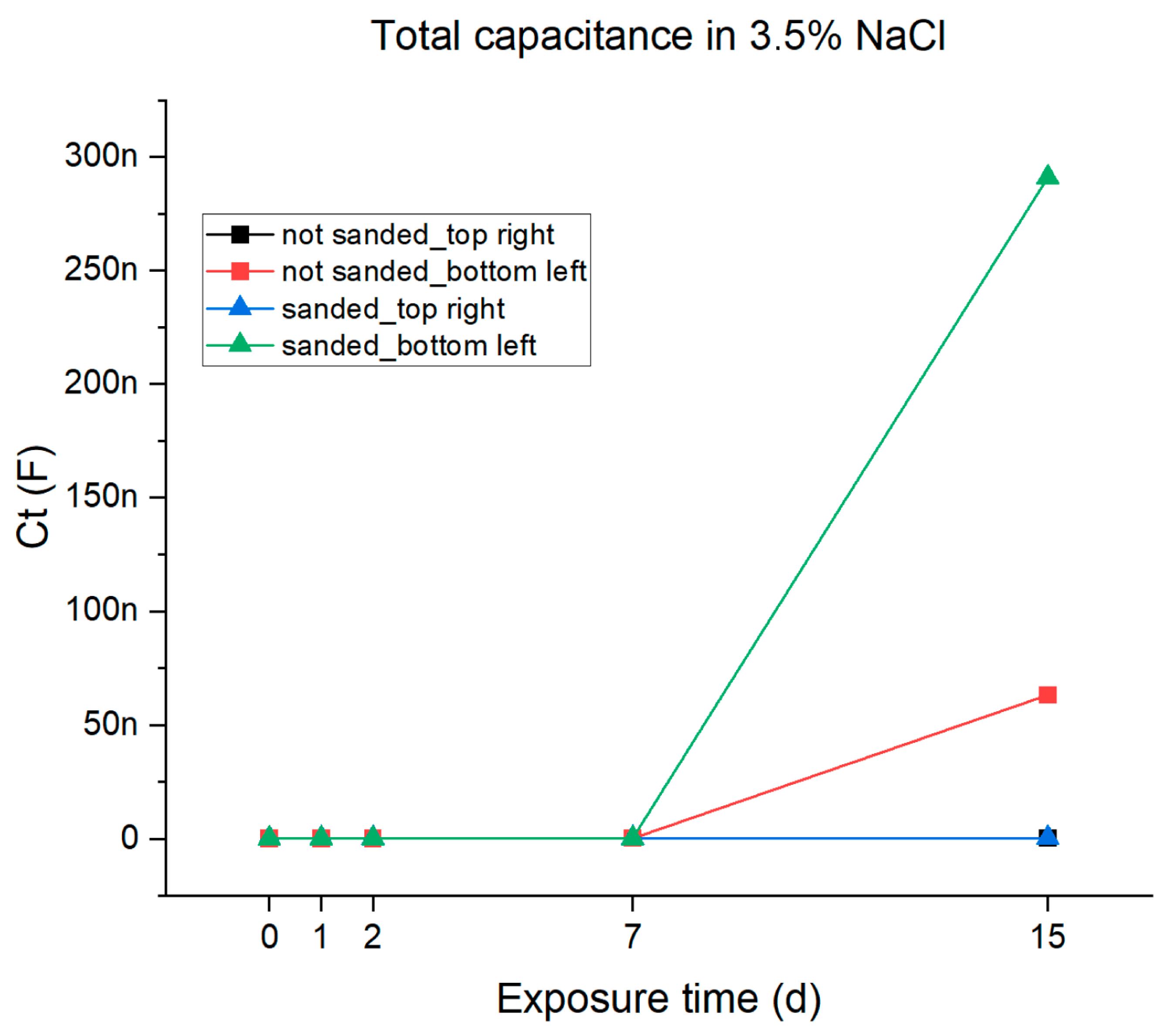 From the data reported in Table 4 and using Equation (1), the total capacitance of all samples was calculated. The results are reported in Table 5 and are plotted against the immersion time in Figure 12. It can be observed that the total capacitance shows a significant increase in samples exhibiting double interface behavior (the ones sampled in the bottom-left position), indicating the increase in charges in the system due to the creation of the passivating layer. This variation in the total capacitance is not observed in the samples taken from the top-right position. The recorded differences in the corrosion behavior related to the different sampling positions can be related, on one hand, to differences in thickness and, on the other hand, to the presence of zinc-based filler in the specific sampling zone that provides active protection.