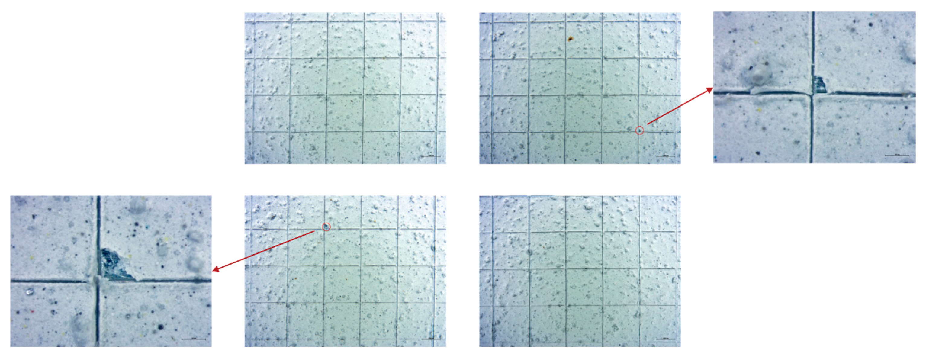 Cross-cut tests mainly returned classification 0 (ISO 2409), indicating no detachment, except one salt-spray-aged sample that showed <5% detachment (class 1) (Figure 15) [30,31].