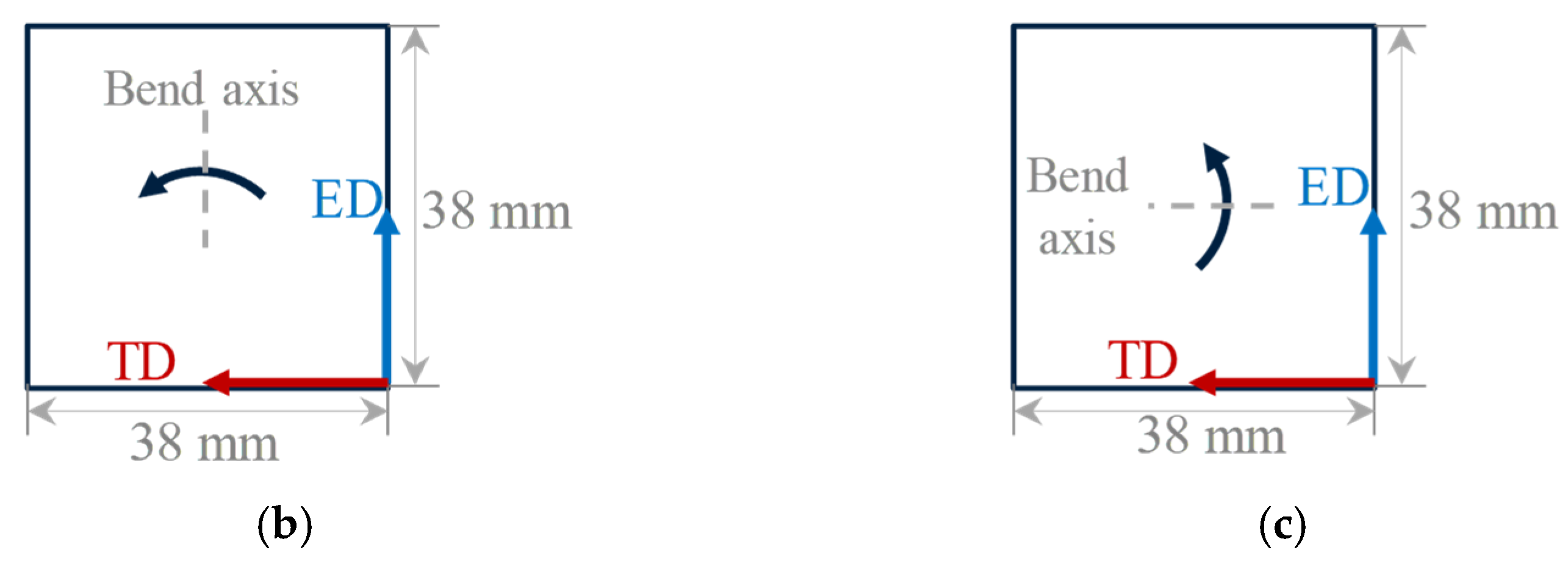 - Troive, L. New method for evaluation of bendability based on three-point-bending and the evolution of the cross-section moment. In Proceedings of the International Deep Drawing Research Group, Munich, Germany, 2–6 July 2017. [Google Scholar]