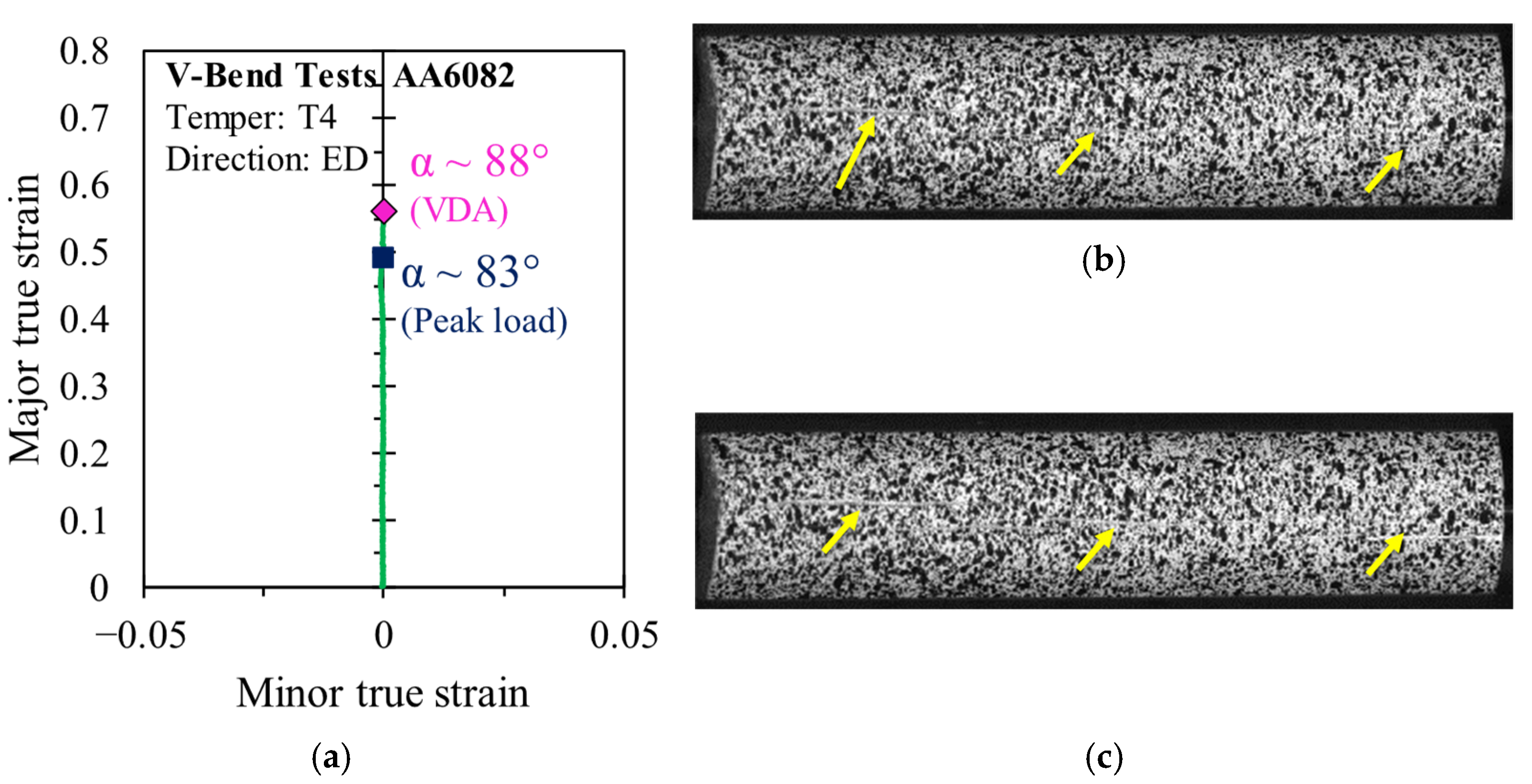 - Cheong, K.; Omer, K.; Butcher, C.; George, R.; Dykeman, J. Evaluation of the VDA 238-100 tight radius bending test using digital image correlation strain measurement. In Proceedings of the International Deep Drawing Research Group, Munich, Germany, 2–6 July 2017. [Google Scholar]