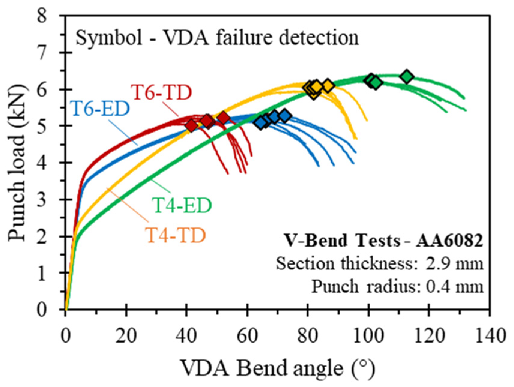 - The bend angle as a unique metric for performance ranking is insufficient for materials with significantly different hardening rates despite similar bend severities. Bend angle analysis should be supplemented with DIC strain measurements. For the studied alloys, a larger bend angle did not correlate with a higher surface strain in plane strain tension. For example, in the T4 condition, bending along the extrusion direction (ED) sustained a much larger VDA bend angle relative to the T6 sample (104° ± 6° versus 68° ± 3°, five repeats), but fracture strains were similar (0.60 ± 0.05 versus 0.58 ± 0.03, five repeats).