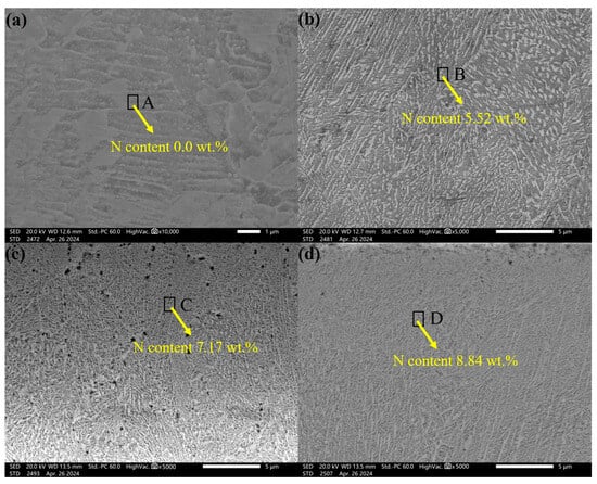 Analysis reveals that un-nitrided samples (0 h) exhibit a smooth surface morphology without detectable nitride layers (Figure 1a), as confirmed by EDS analysis (area A in Figure 1a, N content = 0.0 wt.%). After 24 h of nitriding, a thin and dense nitrided layer forms (the content of N element in area B is 5.52 wt.% in Figure 1b), characterized by distinct acicular structures (Figure 1b). Extending nitriding to 48 h results in the significant thickening of the nitride layer with enhanced microstructural density (Figure 1c), suggesting the increased precipitation of alloying element nitrides (the content of N element in area C is 7.17 wt.% in Figure 1c). The black phase in the figure is micro-pores, which may result from gas entrapment during the rapid diffusion of nitrogen atoms or volume changes caused by phase transformations in the nitride layer. Prolonged nitriding for 60 h further increases the layer thickness (the content of N element in area D is 8.84 wt.% in Figure 1d) but induces microstructural coarsening (Figure 1d), indicating potential surface embrittlement.