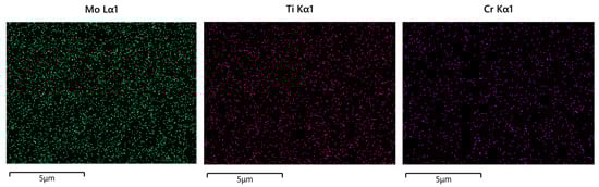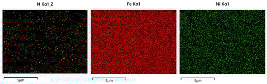 Moreover, Figure 2 displays the surface scanning results of the sample after 60 h of nitriding. Following this prolonged nitriding treatment, the N element exhibits a uniformly enriched distribution in the surface layer, showing a complementary relationship with the distribution trends of Fe, Ni, and Mo elements (the N-enriched zones correspond to a sparser distribution of matrix elements). This indicates that an extended nitriding duration facilitates uniform nitrogen diffusion in the surface layer, where N preferentially bonds with strong nitride-forming elements such as Ti and Cr, forming a continuous nitride-strengthened layer. This microstructure provides the material foundation for enhanced surface wear resistance.