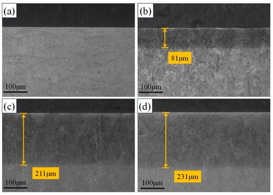The metallographic structures of the cross-sections for non-aged L-PBF manufactured 18Ni300 samples after different nitriding durations are displayed in Figure 3. For the sample without nitriding (0 h, Figure 3a), the typical fusion channel structure is clearly observable. After 24 h of nitriding (Figure 3b), a nitrided layer with a thickness of approximately 79 μm forms on the surface, and the fusion channel structure starts to blur. When the nitriding duration extends to 48 h (Figure 3c), the nitrided layer depth increases notably to about 212 μm, and the original fusion channel structure almost disappears. Upon the further prolongment of nitriding to 60 h (Figure 3d), the nitrided layer depth shows a slight increase to around 238 μm, while the microstructure within the nitrided layer becomes more homogeneous.