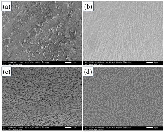 Surface microstructure morphology of L-PBF manufactured 18Ni300 after different heat treatments: (a) aging treatment; (b) aging treatment +24 h nitriding; (c) aging treatment +48 h nitriding; and (d) aging treatment +60 h nitriding.