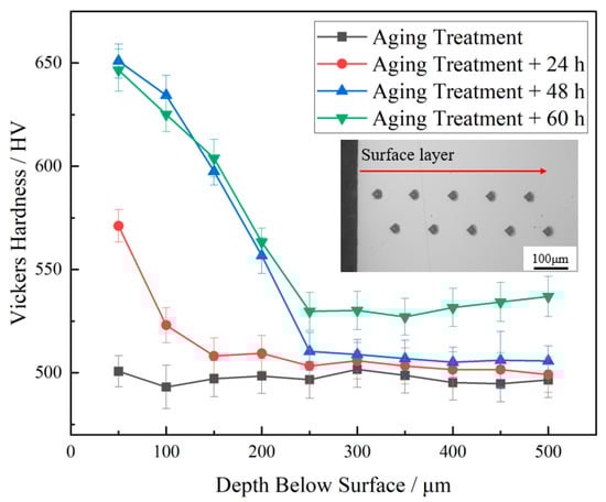 The same hardness measurement method as in Section 3.2.1 was applied to the pre-aged samples, and the results showing the cross-sectional hardness variation are shown in Figure 7. The test results indicate that after the aging treatment, the sample hardness reached approximately 495 HV. Following the subsequent nitriding treatment, the surface hardness of the sample increased with the duration of nitriding. The internal hardness of the sample continued to increase with the duration of nitriding. After 48 h of nitriding, the matrix hardness was approximately 515 HV, and after 60 h of nitriding, the matrix hardness of the sample was approximately 530 HV. The trend of cross-sectional hardness variation in each sample was consistent with the metallographic structure results shown in Figure 4.