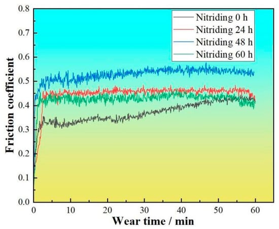 Figure 8 illustrates the variation in the coefficient of friction (COF) of L-PBF 18Ni300 steel with sliding time. As depicted, the COF of the sample increases with nitriding time, from 0 to 48 h. However, when the nitriding duration reaches 60 h, the COF decreases instead. Although longer nitriding could increase surface roughness, at 60 h, the wear process might generate fine nitride debris or lubricious oxide products (e.g., Fe3O4, which has solid lubricant properties). These products can form a protective lubricating layer on the wear scar, offsetting the negative effect of the increased roughness and facilitating smoother sliding.