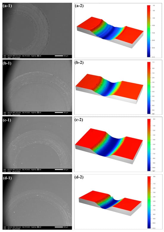 Figure 9 illustrates the wear morphology of L-PBF 18Ni300 steel under varying nitriding durations. In the figure, a-1, b-1, c-1, and d-1 represent the macro-SEM images of wear morphology after nitriding for 0 h, 24 h, 48 h, and 60 h, respectively, while a-2, b-2, c-2, and d-2 correspond to the wear 3D topography after nitriding for 0 h, 24 h, 48 h, and 60 h, respectively. Macro-SEM images (a-1 to d-1) reveal that the un-nitrided (0 h) surface exhibits the deepest and widest wear scars, with pronounced plowing grooves and adhesive spalling. After nitriding, wear scars shallow significantly, and spalling areas diminish, indicating reduced wear severity. Three-dimensional topography (a-2 to d-2) further confirms this trend; the 0 h sample shows the maximum wear depth (~31 μm), while the nitrided samples (24 h, 48 h, 60 h) display markedly lower depths (~9–11 μm). The slight rebound in wear depth after longer nitriding (>24 h) may be attributed to the increased brittleness of the nitrided layer, leading to minor spalling during wear.