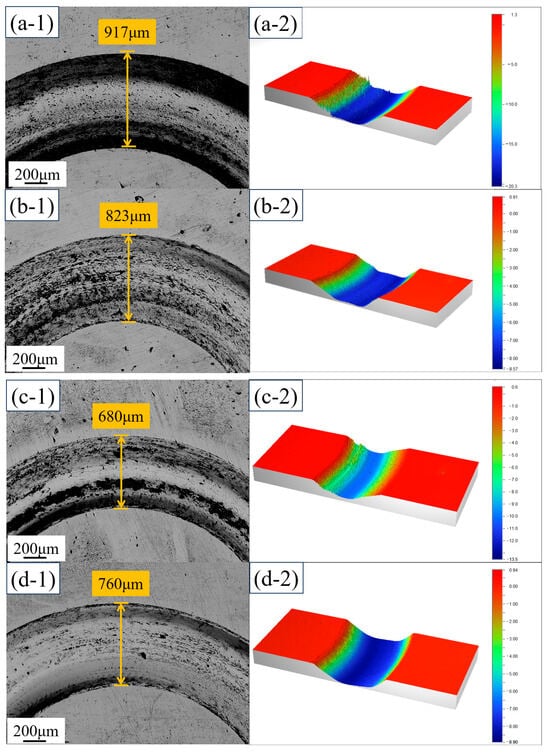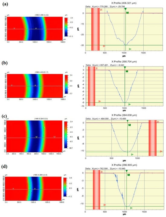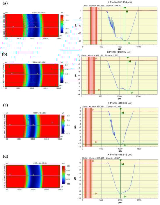 The cross-sectional wear measurements of pre-aged L-PBF 18Ni300 steel. (a) Aging treatment; (b) aging +24 h nitriding; (c) aging +48 h nitriding; and (d) aging +60 h nitriding.