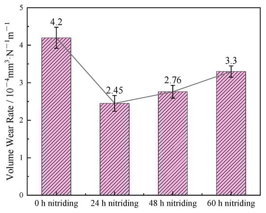 The volume wear of each sample was calculated based on the three-dimensional wear contour results, and the volume wear rate was calculated using (1), as shown in Figure 16.
