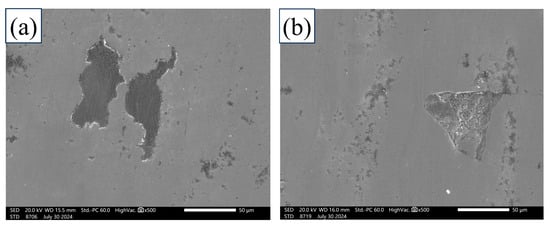 When non-aged samples are not subjected to solution and aging treatments, the matrix interior is mainly composed of an austenite structure. In this as-received state, the samples are less hard and are most susceptible to wear. After the nitriding treatment, nitrides such as FeN and CrN are directly formed on the surface layer, leading to an increase in surface hardness. However, for the samples nitrided for 24 h, during the friction and wear process, the surface layer material breaks and disperses on the wear scar surface. Under the continuous action of the counterpart ball, a lubricating film with a wear-reducing effect is formed on the wear scar surface, as shown in Figure 12a. Additionally, due to the relatively less hard the surface layer, the particles generated after the surface layer is damaged fail to remove the lubricating film. For samples nitrided for 48 h and 60 h, the harder surface layer causes the particles formed by surface damage during sliding to act as hard abrasive particles instead, which accelerate the wear process. Furthermore, a stable lubricating film region cannot be formed, as shown in Figure 12b. Therefore, as the nitriding time is extended, the wear is exacerbated instead.
