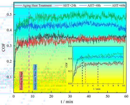 The sliding friction and wear process is divided into an early running-in stage and a subsequent stable wear stage []. For each sample, the friction coefficient curve during the stable wear stage shows minimal fluctuation, indicating a relatively smooth overall wear process on the sample surface. However, the running-in stage varies with the heat treatment method. The results show that the samples that receive only the aging treatment have the longest running-in stage, taking approximately 5 min to enter the stable stage. In contrast, the samples after nitriding treatment exhibit a significantly reduced running-in stage. The samples that receive aging +24 h nitriding treatment have a running-in stage of about 2.5 min, while the samples that receive 48 h and 60 h nitriding treatments have similar running-in stages, lasting about 2 min. The increased friction coefficient and the significantly shortened early running-in stage for the nitrided samples are primarily due to the rougher surface of the nitride samples compared to on the aged samples. As the nitriding time increases, more metal nitrides and intermetallic compounds precipitate on the sample surface. Additionally, to avoid damaging the surface nitride layer, the samples are not polished again before the friction and wear test, leading to the higher friction coefficient and the shorter running-in stage.