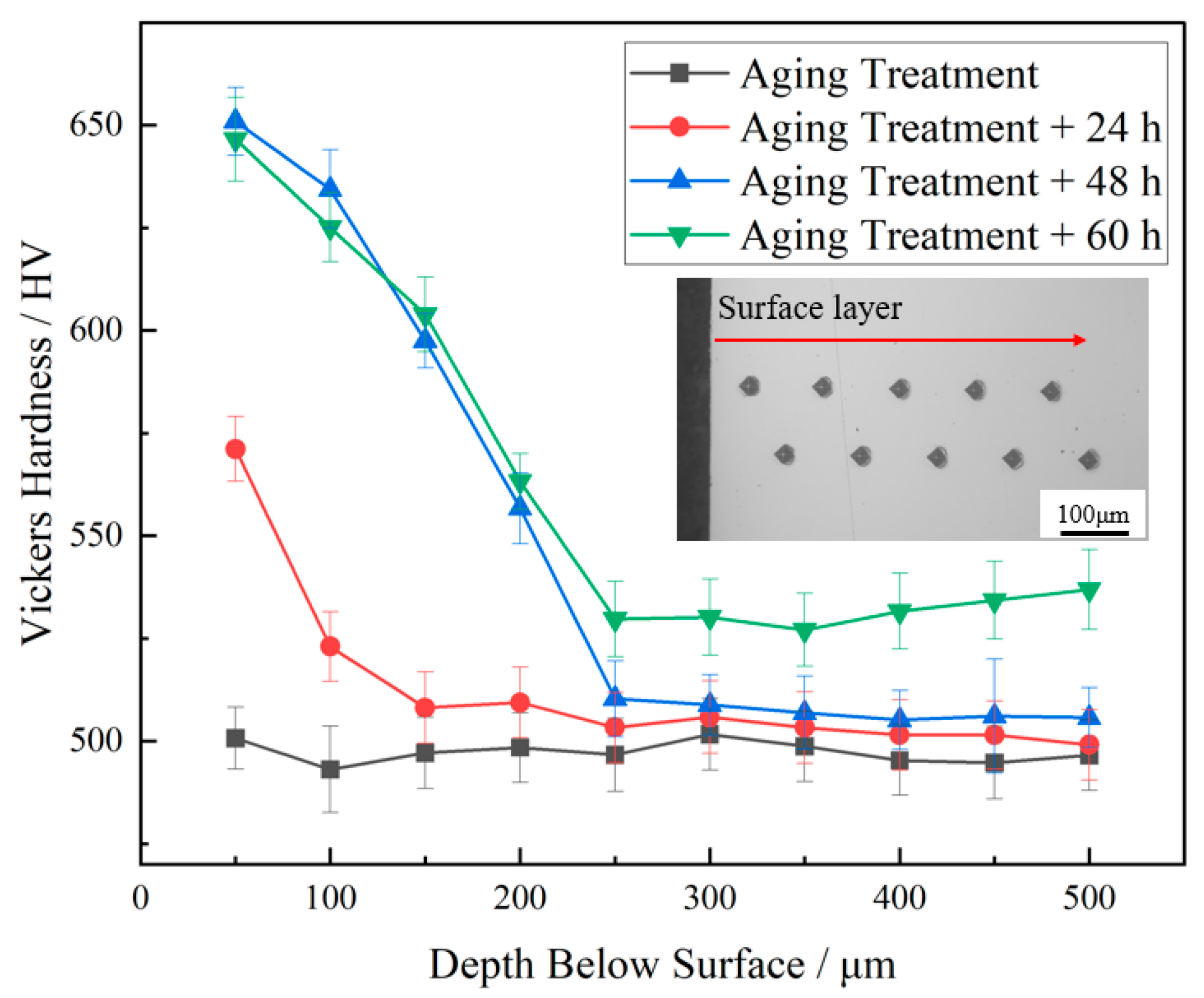 3.2.2. Cross-Sectional Hardness of Pre-Aged Specimen