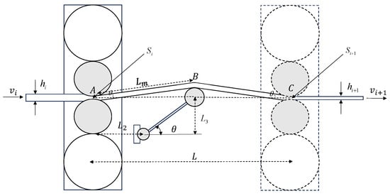 Equation (10) shows that to maintain material flow continuity, the speed of stand i must be dynamically adjusted to accommodate downstream thickness changes. Mismatched speeds will directly impact looper length changes, which in turn affect the looper angle . The length of the strip produced by stand i per unit time is , while the throughput length of stand is . The difference between these two is the instantaneous variation rate of looper length. Accumulated over time, it is given that