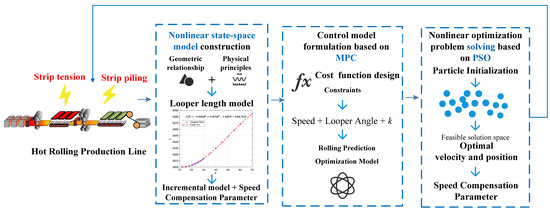 The main objective of this paper is to achieve stable looper angle control in hot strip rolling under abnormal conditions such as strip tension and strip piling through a speed compensation strategy that integrates PSO with MPC. Based on this objective, the following research questions are formulated: RQ1: What are the fundamental mechanisms leading to strip tension and strip piling, and how can these abnormal conditions be theoretically prevented from the perspective of looper angle deviation and inter-stand speed mismatch? RQ2: How can a nonlinear state-space model of the looper and the inter-stand system be constructed with a dynamic compensation parameter, providing a physically interpretable foundation for control algorithm design? RQ3: How can the control algorithm be designed to achieve real-time optimization of the speed compensation parameter?