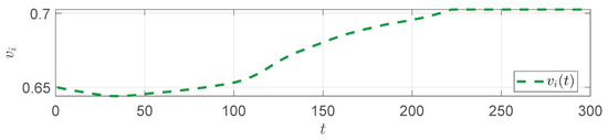 Figure 10 shows the trend in the compensation parameter during the simulation process. It can be observed that the compensation factor can adaptively adjusted according to the disturbance. Figure 11 shows the front stand speed curve. With the compensation from , the speed is always kept within the safe range, ensuring the operational safety of the equipment. Figure 12 shows the looper angle response curve, indicating that the looper angle approaches the ideal value through the PSO-MPC control, thus solving the strip piling issue.
