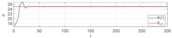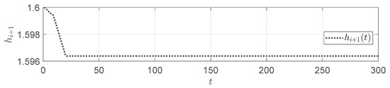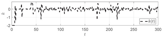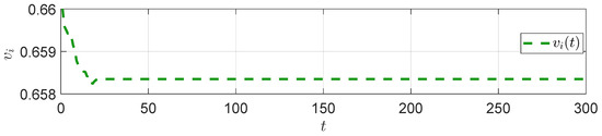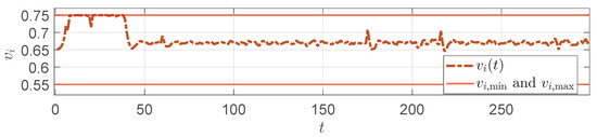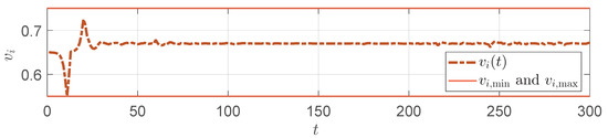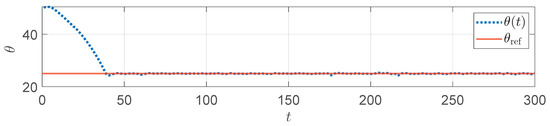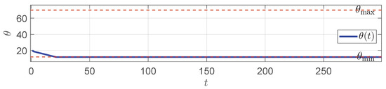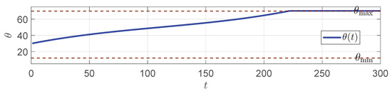 In each generation, all particles will predict the corresponding angle based on the current solution , compute the cost function J as the fitness value, and update the search space according to (25). The search process is iterated until the maximum number of iterations is reached. The final optimal solution is the optimal control input sequence at the current moment, and only the first value, , is applied to the system.