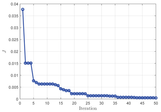 During the operation of the compensation controller, the PSO algorithm iteratively optimizes the compensation parameter sequence k within the prediction horizon at each time step to minimize the cost function J. At a simulation step , the trend in the cost function during the particle swarm optimization iteration is recorded, as shown in Figure 16. It can be seen that PSO can quickly converge to an optimal solution within a limited number of iterations. This rapid convergence indicates that the algorithm has practical feasibility for real-time industrial applications, as it can obtain effective compensation parameters within the short control cycle of the rolling process. Therefore, PSO ensures that the controller can respond to process fluctuations promptly and maintain looper stability in actual production.