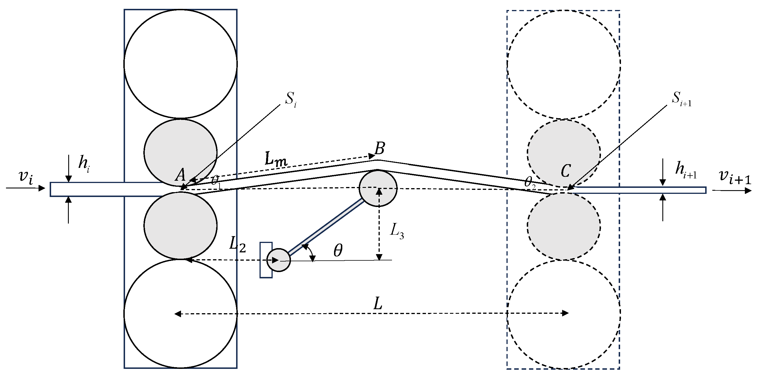 Equation (10) shows that to maintain material flow continuity, the speed of stand i must be dynamically adjusted to accommodate downstream thickness changes. Mismatched speeds will directly impact looper length changes, which in turn affect the looper angle θ . The length of the strip produced by stand i per unit time is v i d t , while the throughput length of stand i + 1 is v i + 1 d t . The difference between these two is the instantaneous variation rate of looper length. Accumulated over time, it is given that