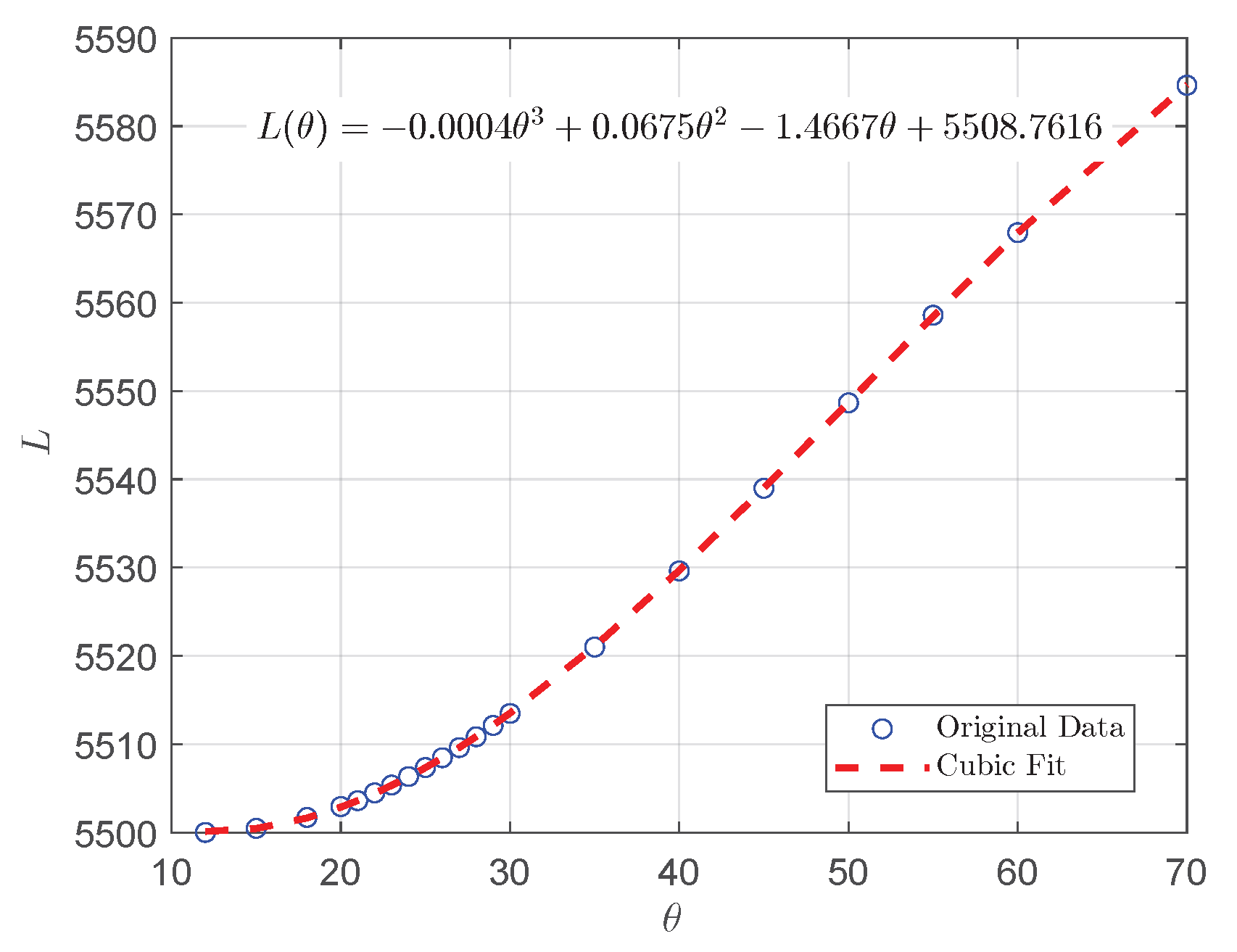 However, in practical engineering applications, such expressions are too complex. Therefore, the variation in looper length is approximated and regressed against the looper angle, yielding the following mapping function L = H ( θ ) :