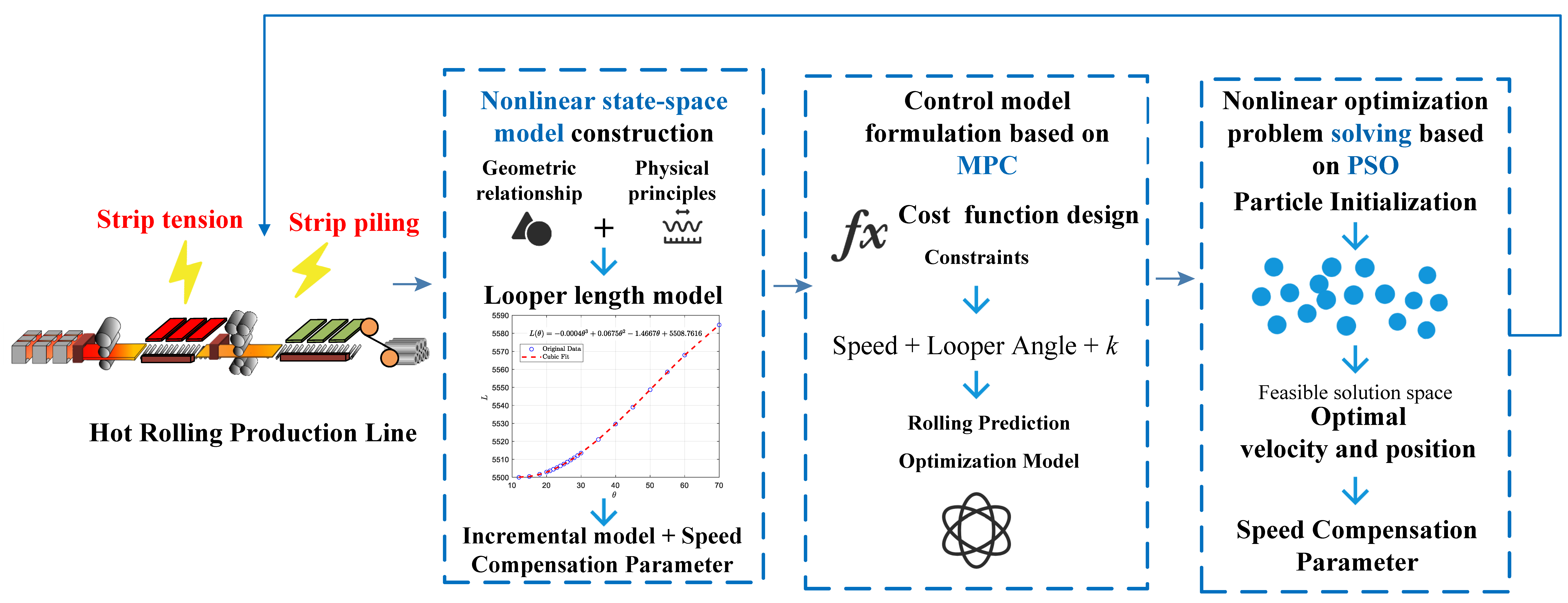 Inspired by recent studies on system identification and control under constrained or adversarial information environments, such as binary-valued observations and cyber-attacked communication channels [23,24,25,26], this work extends the idea of modeling precision and robustness into the hot strip looper control field. These studies demonstrate that accurate system modeling and identification remain feasible even under limited or tampered data conditions, providing valuable insight for developing control strategies that can actively compensate for abnormal process disturbances in complex industrial systems. With the continuous development of advanced algorithms, an increasing number of emerging control paradigms have been introduced, enabling more effective realization of active compensation strategies. Ref. [27] proposed a neural network model predictive control method combined with process monitoring to address product quality stabilization under abnormal industrial conditions, demonstrating the effectiveness of data-driven predictive control. Ref. [28] introduced a pass design method based on reinforcement learning and an analytical rolling model to ensure the mechanical properties of the final product. By combining a physical strengthening model with an analytical rolling model, this approach tracks microstructural evolution during rolling and predicts yield and tensile strength. Ref. [29] presented a plate shape recognition method for the roller cooling process, combining the global optimization capability of PSO with the descriptive power of Gaussian functions to capture shape defects better. Ref. [30] developed a hybrid model for the design and control of a continuous dry granulation process, facilitating the implementation of nonlinear model predictive control (NMPC) in the Alexanderwerk WP120 roller compactor. Ref. [31] proposed a PSO-NMPC control strategy that integrates the PSO algorithm into the NMPC controller to enhance the path tracking performance of underground Load-Haul-Dump (LHD) vehicles. Both refs. [30,31] demonstrated that the proposed control approaches possess practical engineering applicability.