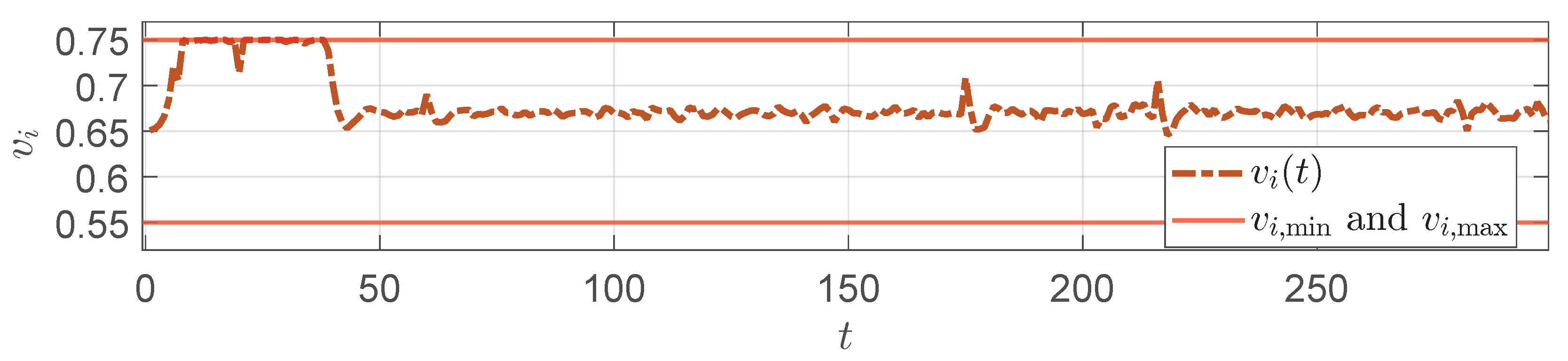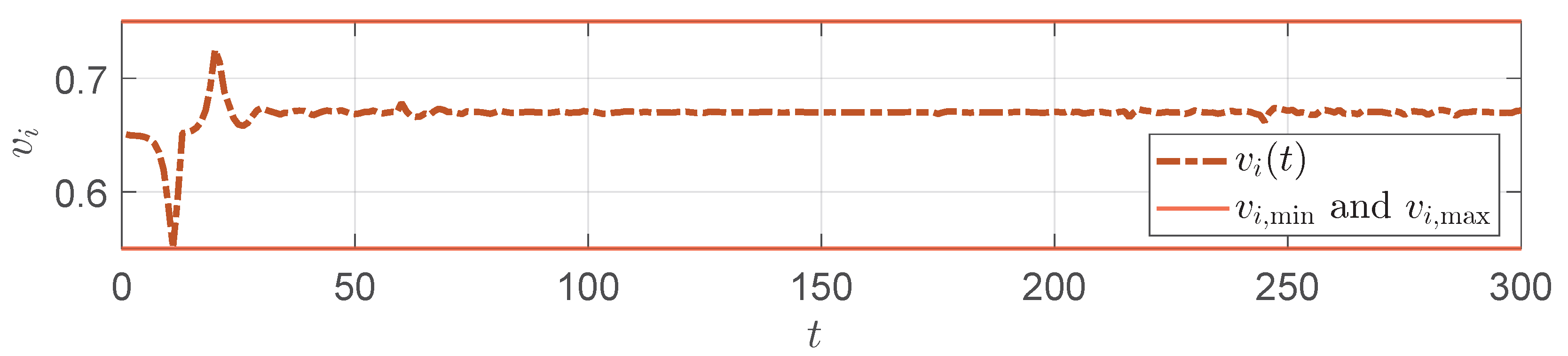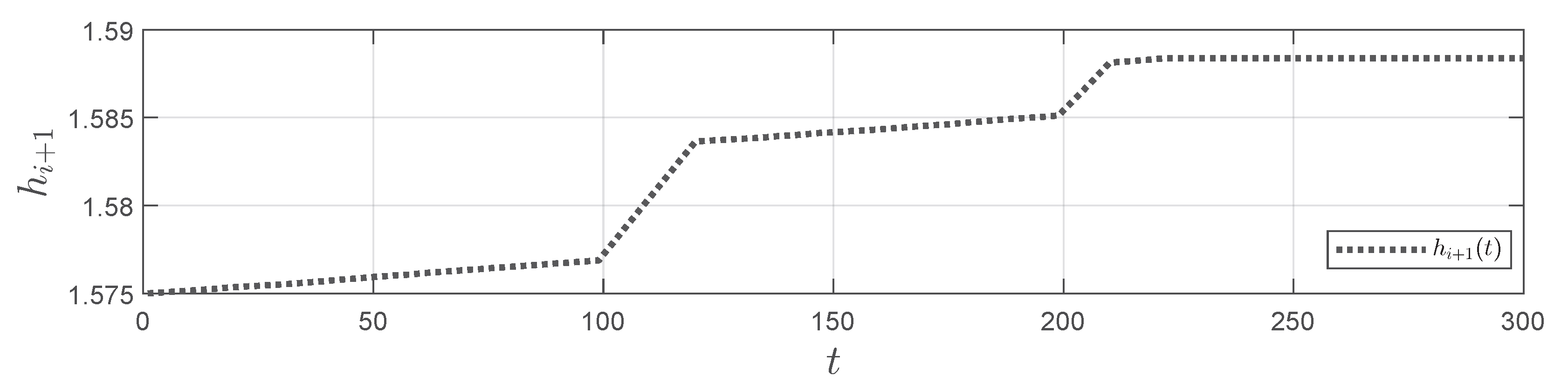 x ( t ) = v i ( t ) , v i + 1 ( t ) , h i ( t ) , h i + 1 ( t ) , L ( t ) T , u ( t ) = k ( t ) , Δ s i + 1 ( t ) , Δ s i ( t ) T , y ( t ) = L ( t ) , θ ( t ) T .