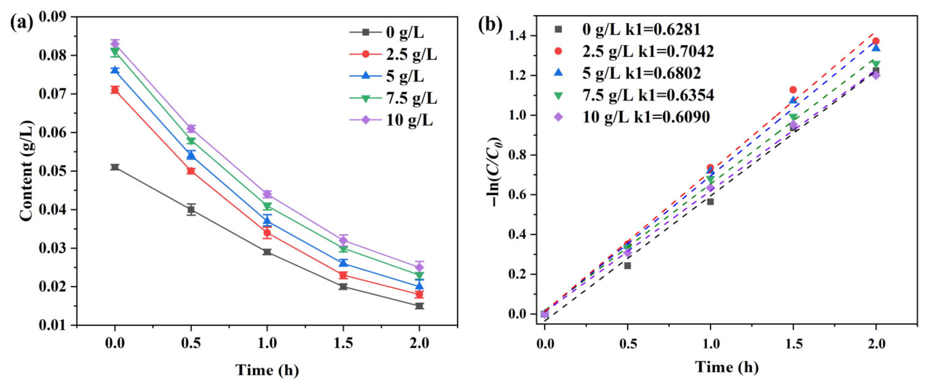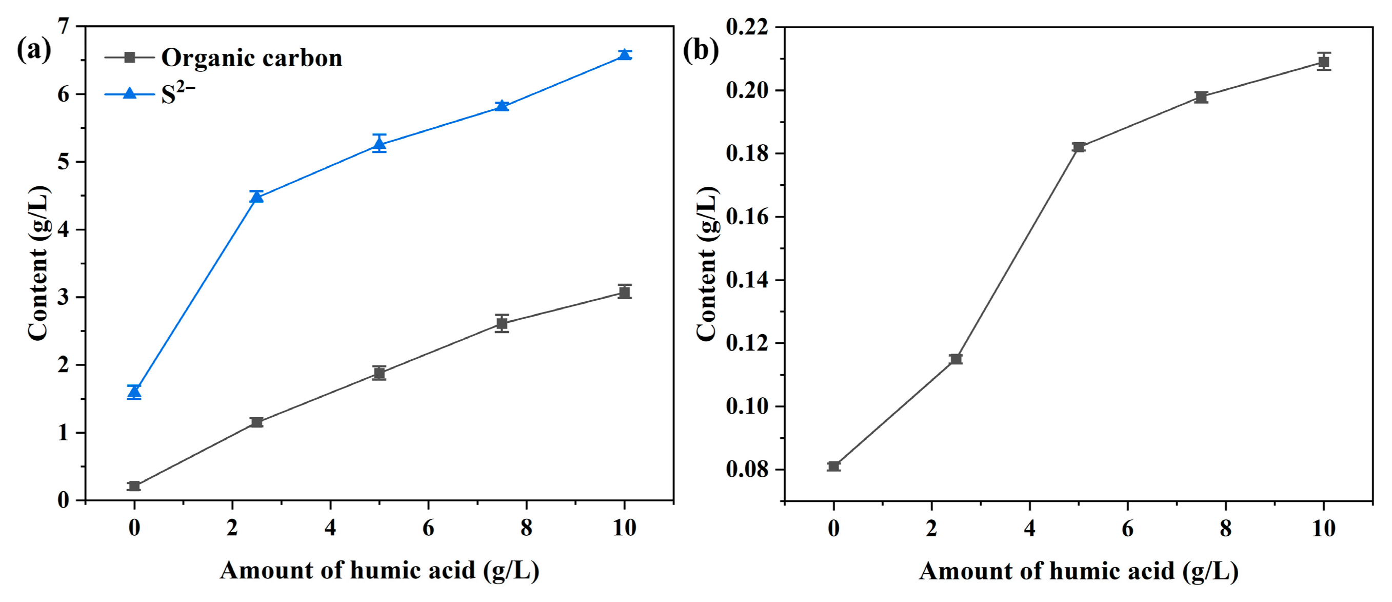 - After the cooling and dilution of the digested liquor (from 270 to 100 °C), the iron concentration in the diluted solution exhibited a positive correlation with the organic compounds content. Furthermore, the iron concentration in the diluted solution increased from 0.052 to 0.085 g/L when the content of humic acid added increased from 0 to 10 g/L. Complexation between iron ions and organic compounds increases the equilibrium iron concentration in the solution, with the majority (approximately 90%) of iron present being in Fe2+ form.