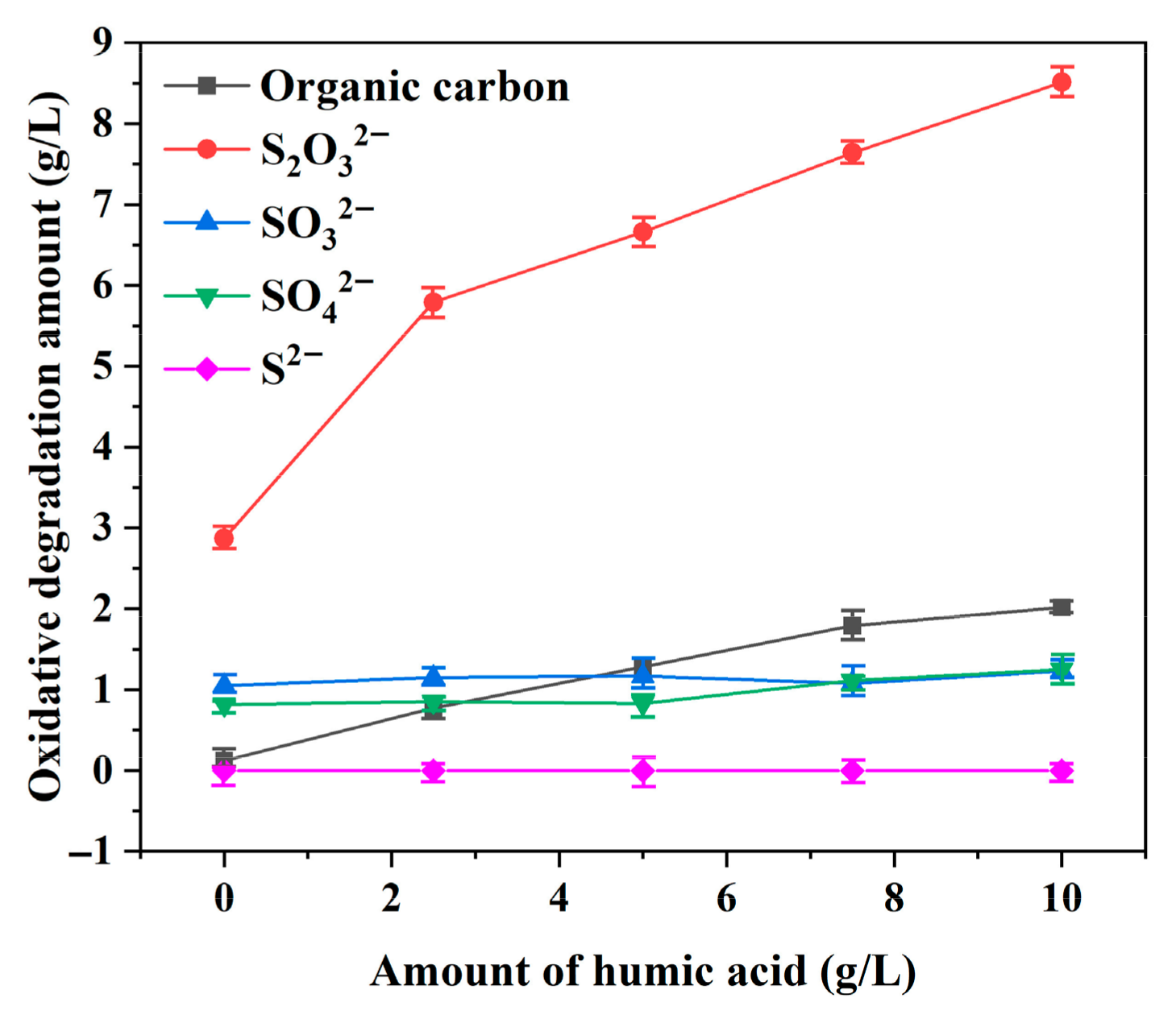 - Under the high-temperature and highly alkaline digestion conditions of the Bayer process, fulvic acid and its transformed organic derivatives accelerate the dissolution of pyrite by complexing with iron ions, thereby disrupting the hydrophilic iron hydroxide (or ferrous hydroxide) film formed on the pyrite surface. This leads to a sharp increase in the iron concentration in the digested liquor. The iron content in the digestion solution increased by 1.6 times (from 0.08 to 0.208 g/L) when the amount of humic acid added increased from 0 to 10 g/L.