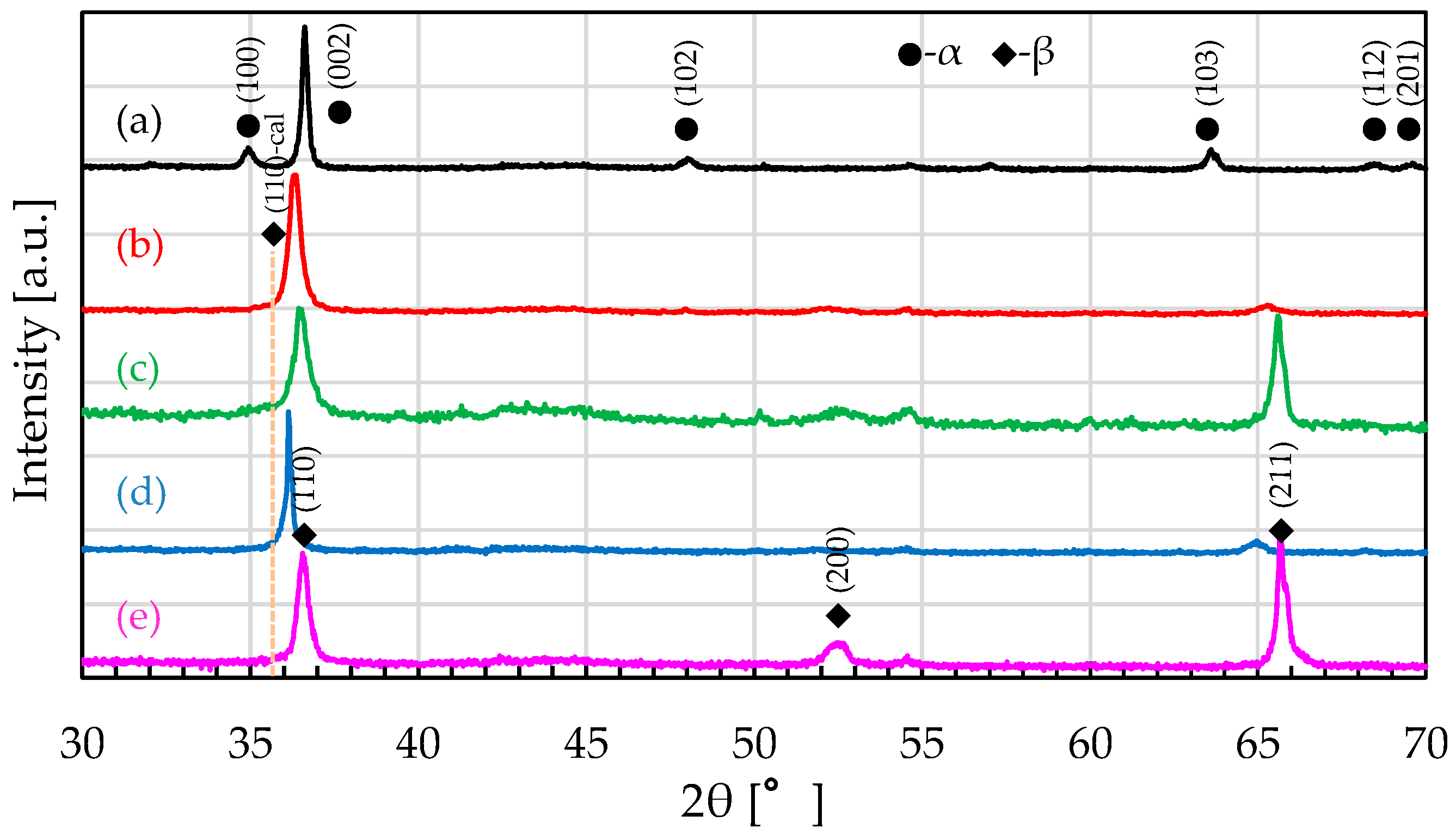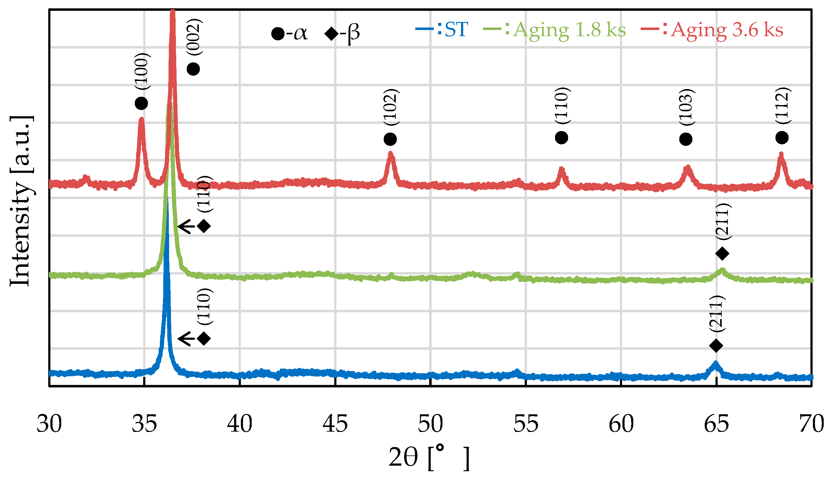- Zhanal, P.; Harcuba, P.; Hajek, M.; Smola, B.; Strasky, J.; Smilauerova, J.; Vesely, J.; Janecek, M. Evolution of ω phase during heating of metastable β titanium alloy Ti–15Mo. J. Mater. Sci. 2018, 53, 837–845. [Google Scholar] [CrossRef]