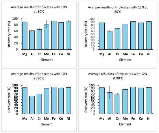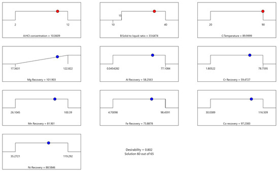 | Run | Acid Concentration (mol/L) | Solid to Liquid Ratio (%) | Temperature (°C) | Mg (%) | Al (%) | Cr (%) | Mn (%) | Fe (%) | Co (%) | Ni (%) |