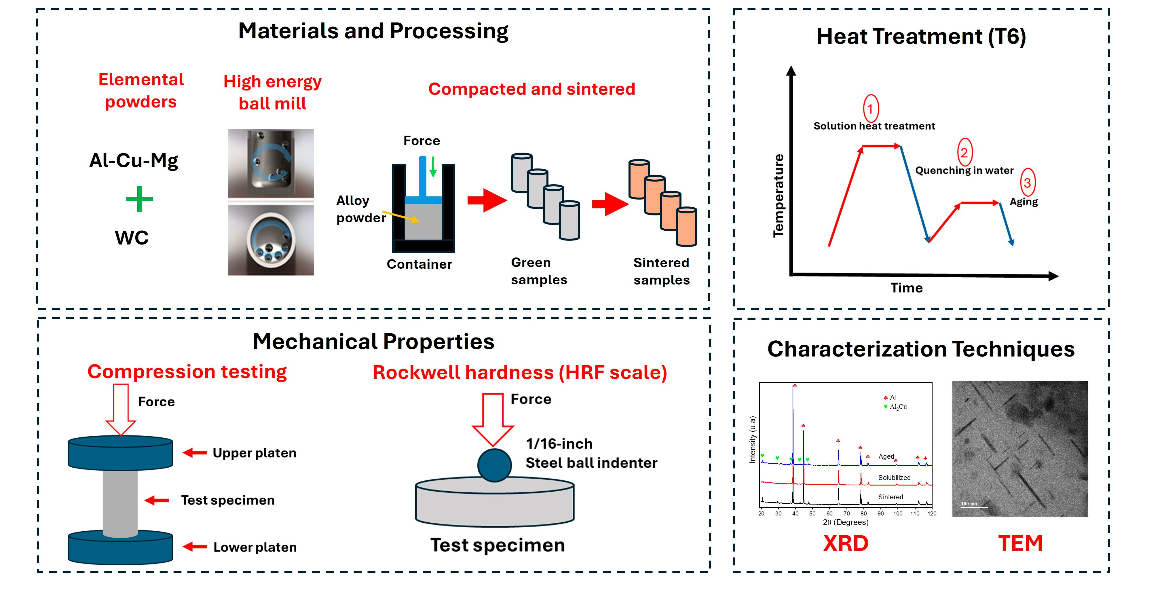Rodríguez-Cabriales, G.; Flores-De los Ríos, J.P.; López de Lara-Herrera, J.F.; Sánchez-Carrillo, M.; Medrano Prieto, H.M.; Mendoza-Duarte, J.M.; Ruiz-Esparza-Rodríguez, M.A.; Garay-Reyes, C.G.; González, S.; Martínez-García, A.; et al. Synergistic Effects of Sub-Micron WC Reinforcement and T6 Heat Treatment on the Evolution of Microstructure and Mechanical Behavior in Al–Cu–Mg Composites Fabricated Through Powder Metallurgy. Metals 2025, 15, 1216. https://doi.org/10.3390/met15111216