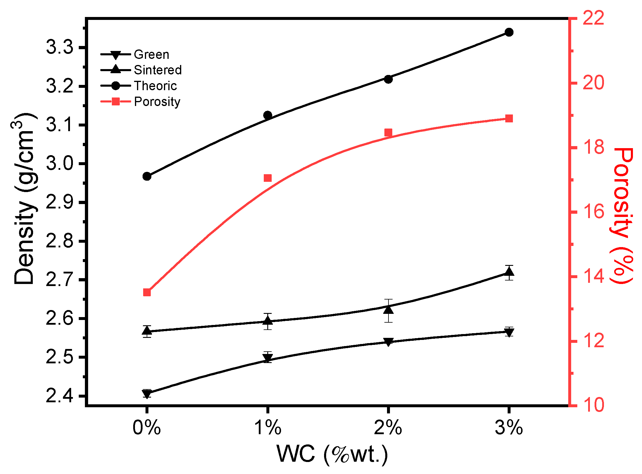 - The 3 wt.% WC composite exhibited superior hardness and compressive strength compared to the unreinforced alloy.