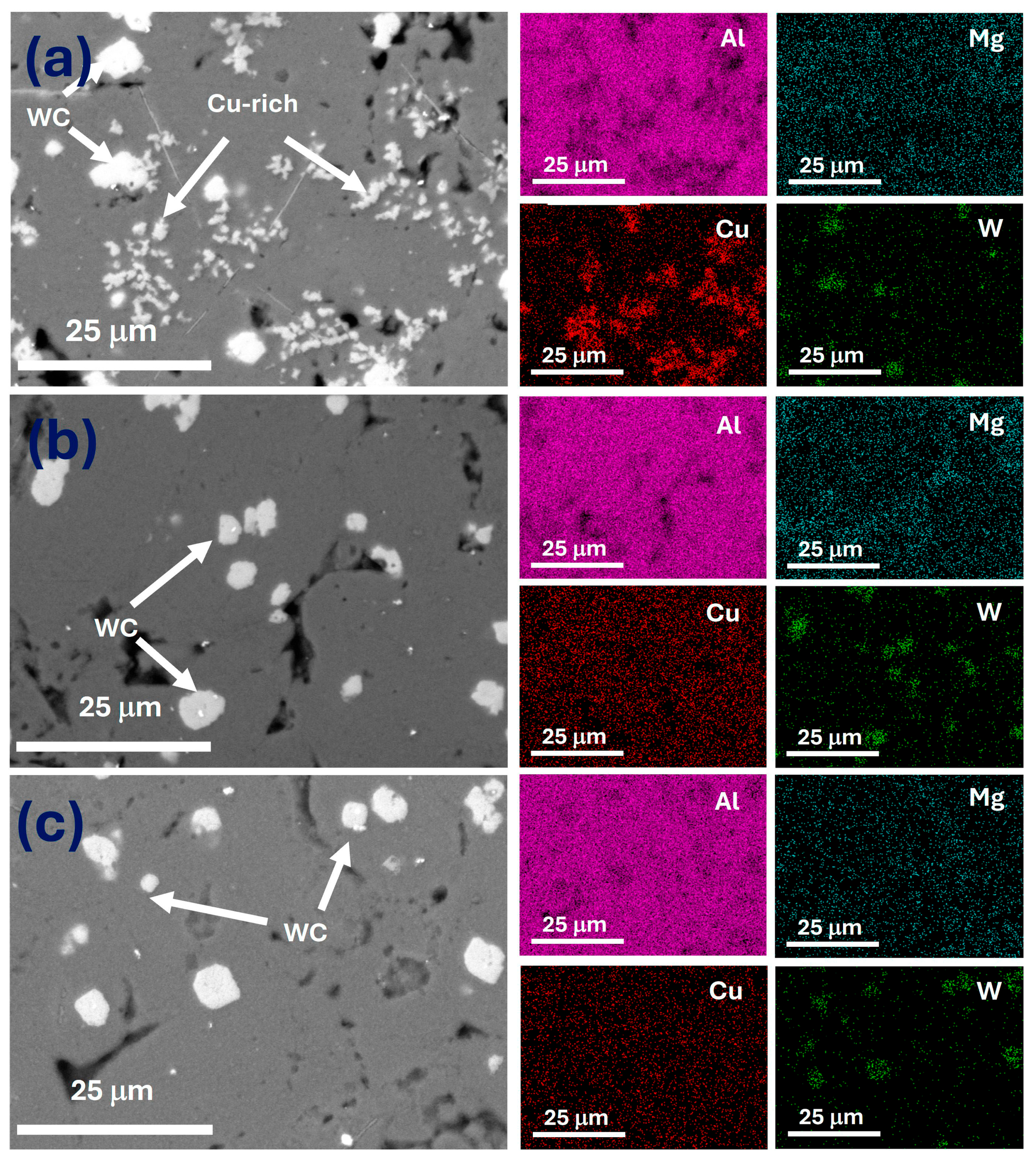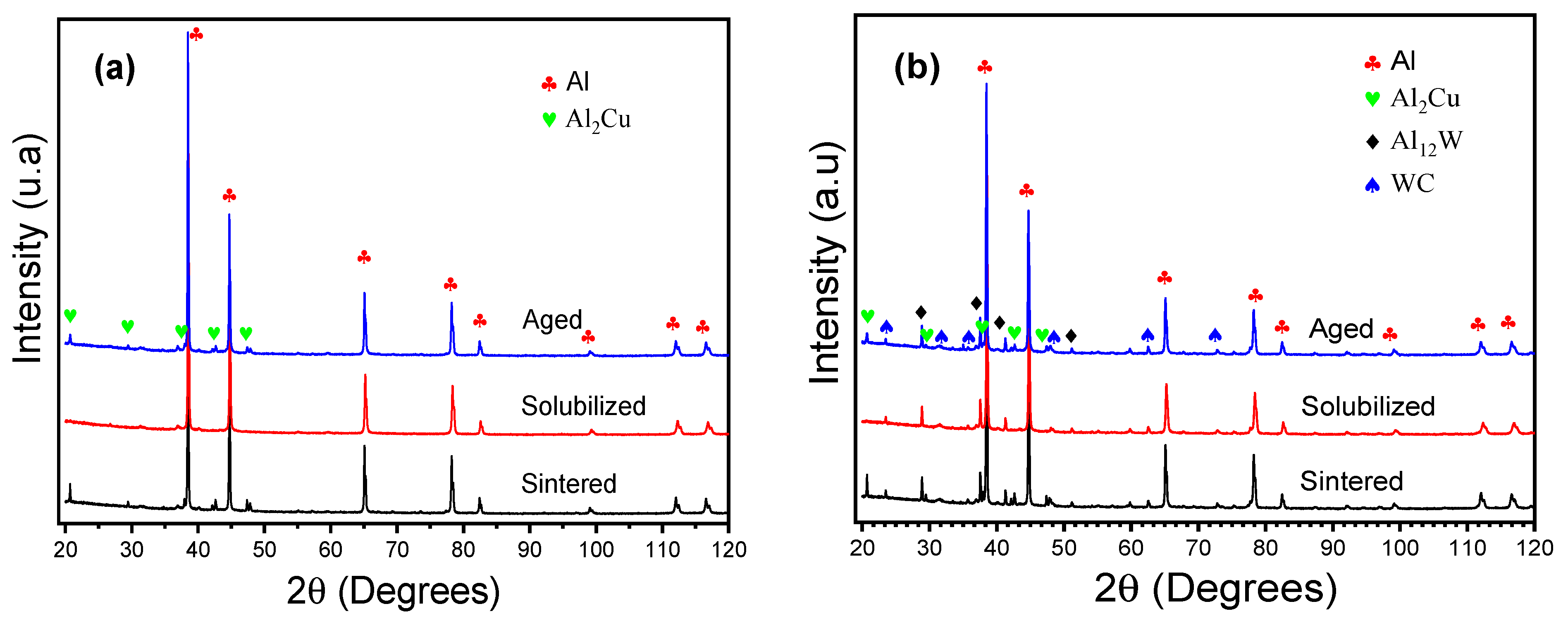 - Rodríguez-Cabriales, G.; Lometo-Sánchez, A.M.; Guía-Tello, J.C.; Medrano-Prieto, H.M.; Gutiérrez-Castañeda, E.J.; Estrada-Guel, I.; Garay-Reyes, C.G.; Hernández-Rivera, J.L.; Cruz-Rivera, J.J.; Maldonado-Orozco, M.C.; et al. Synthesis and characterization of Al-Cu-Mg system reinforced with tungsten carbide through powder metallurgy. Mater. Today Commun. 2020, 22, 100758. [Google Scholar] [CrossRef]