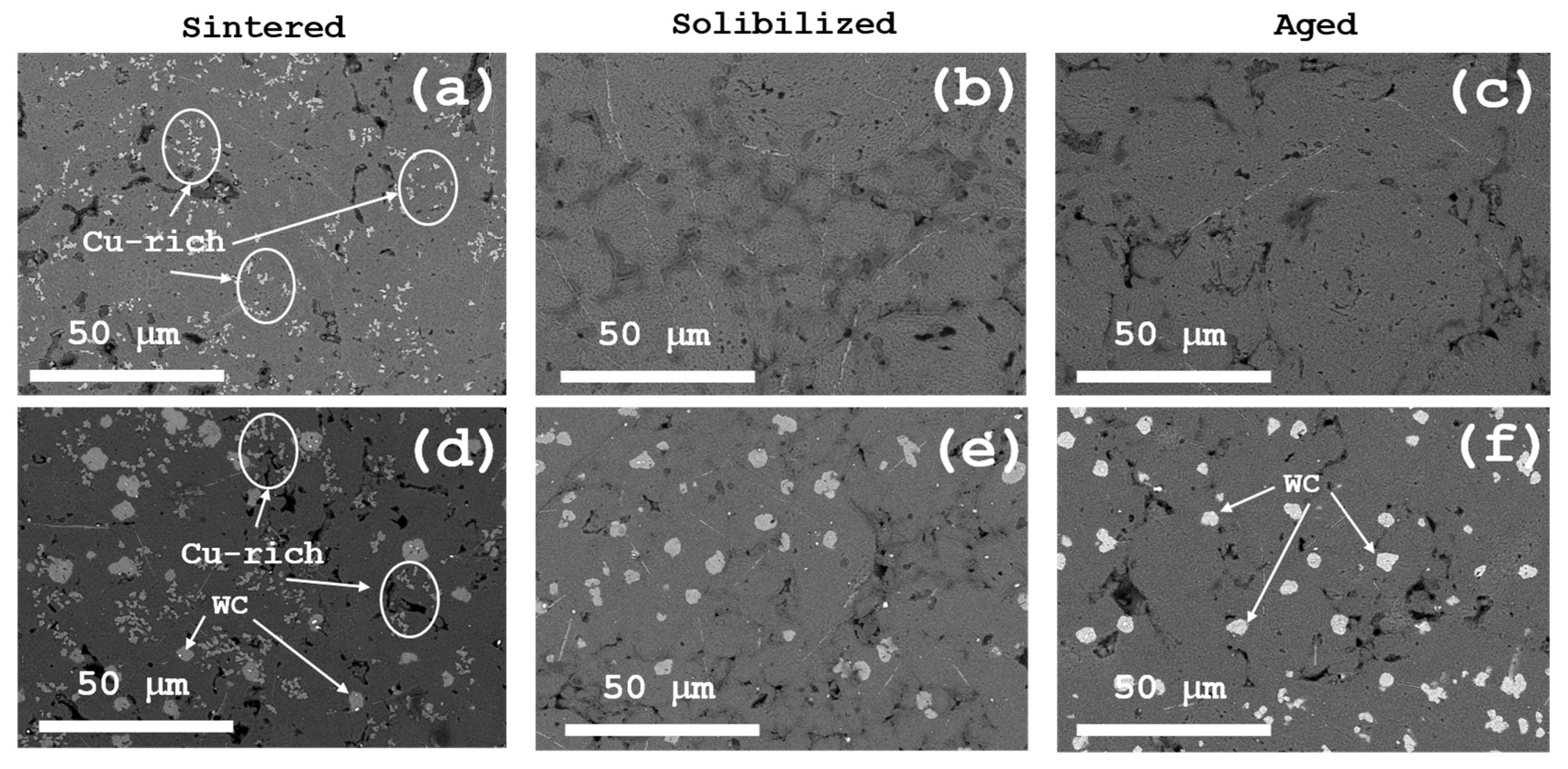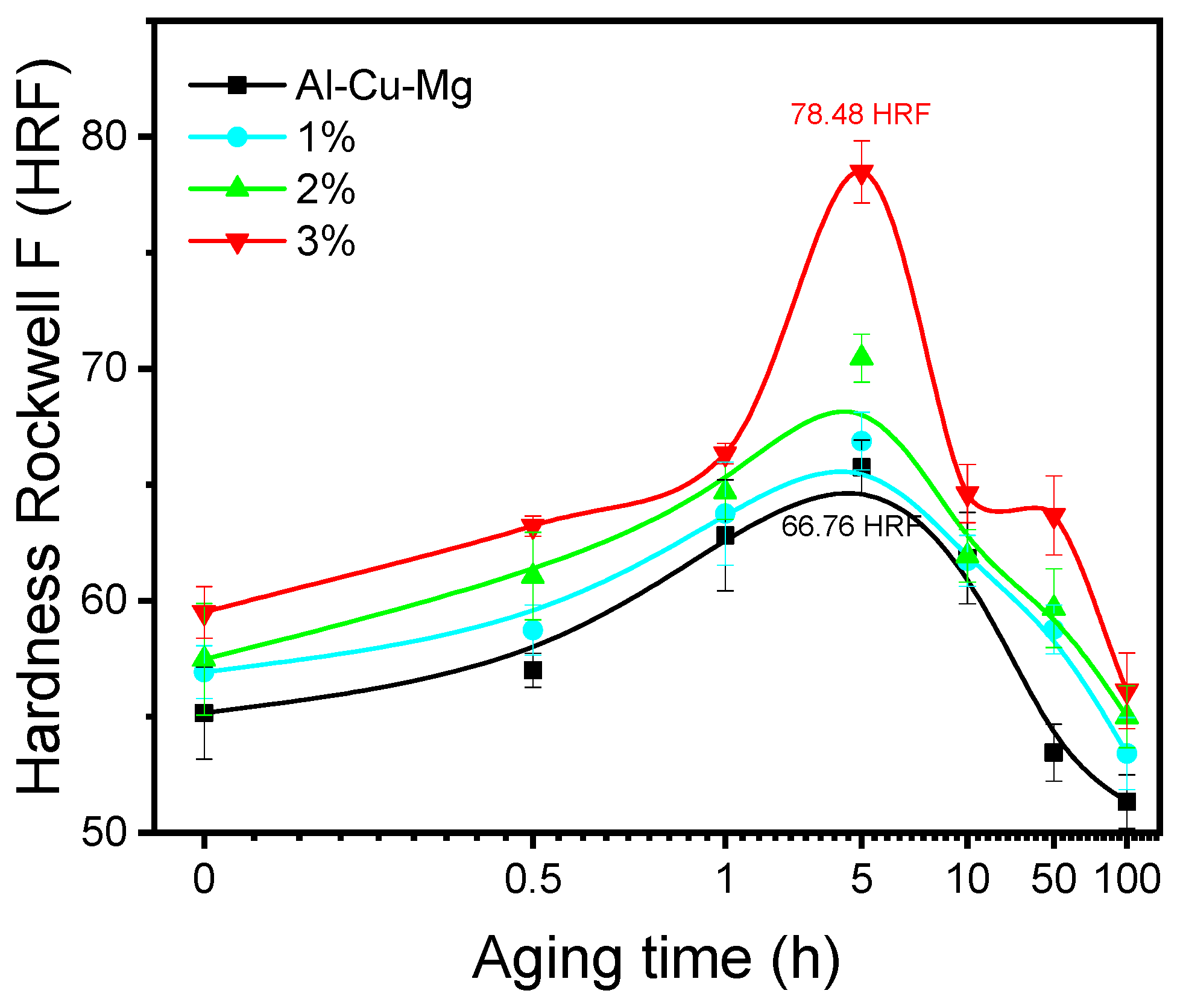 - The incorporation of sub-micron WC particles did not delay the aging kinetics; all composites reached peak hardness at the same time as the unreinforced alloy, demonstrating that fine WC reinforcement enhances mechanical strength without compromising heat-treatment efficiency.