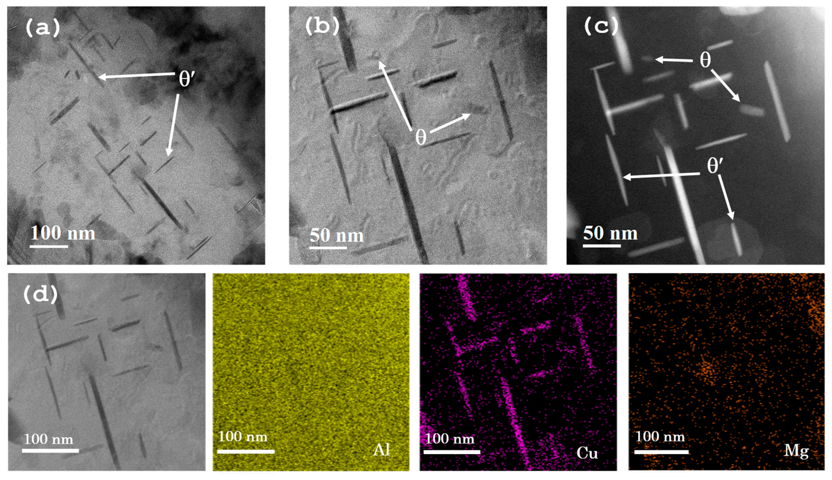 - XRD and TEM revealed that the strengthening precipitates correspond exclusively to the metastable θ′ (Al2Cu) phase under the applied aging conditions.