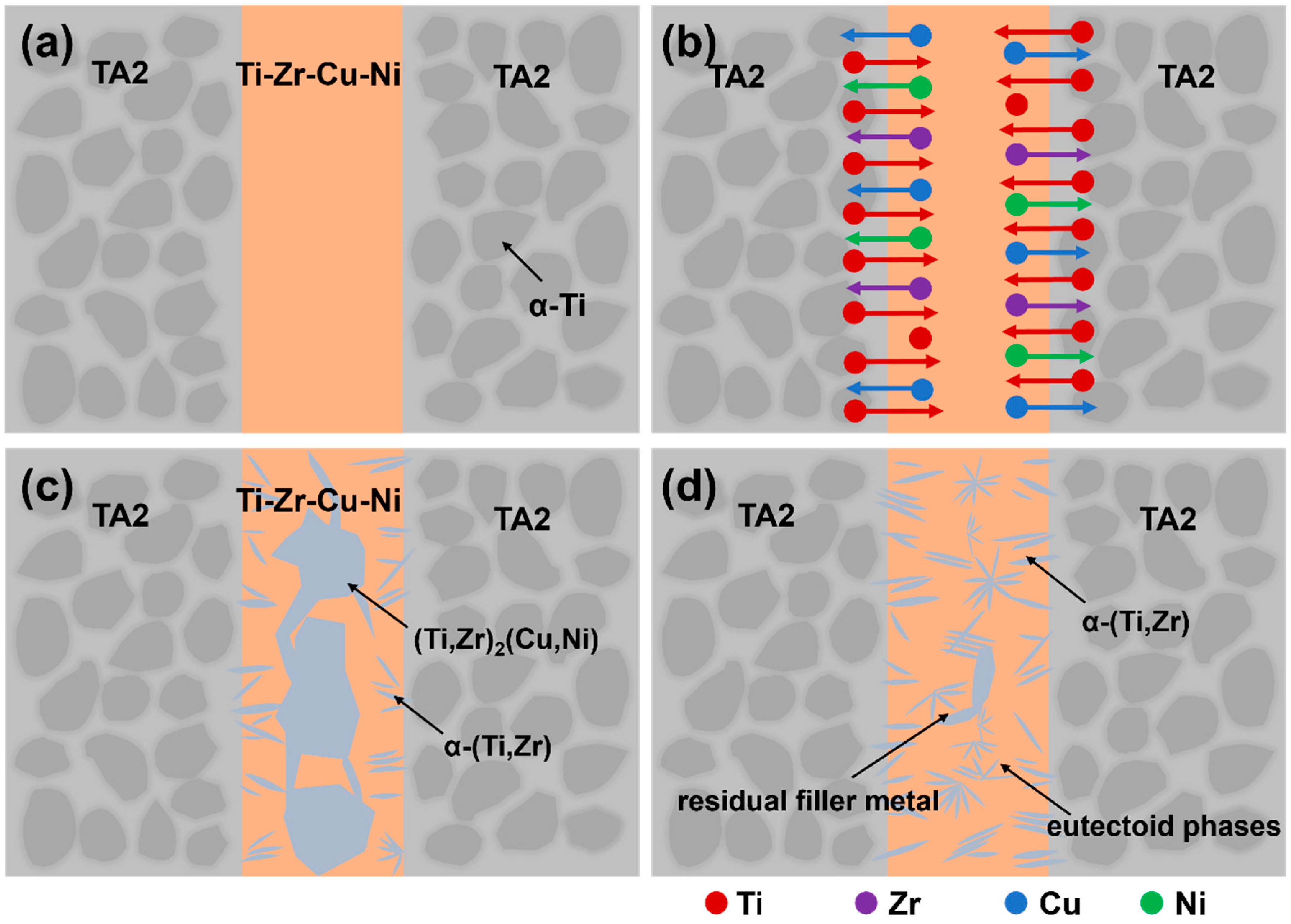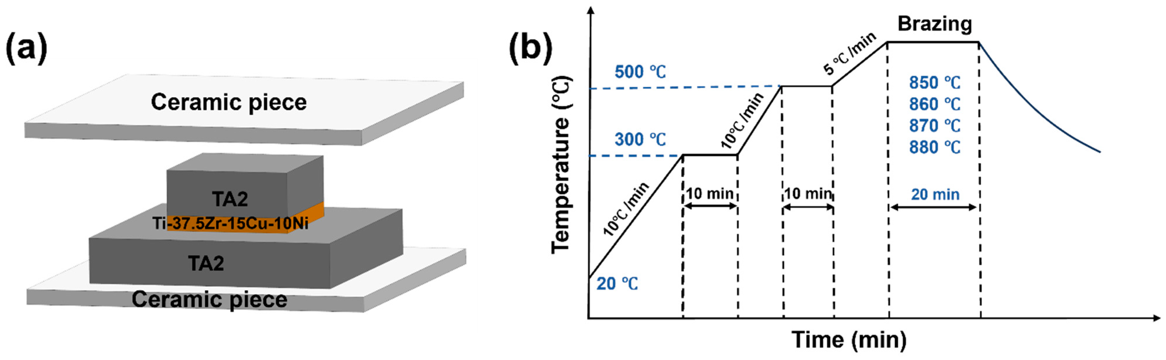 - Tian, H.; Xiong, J.; Zhao, L.; Mei, J.; Qi, Y.; Wu, J.W.; Li, K.K.; He, J.C.; Zhang, T.Y. Enhanced vacuum brazing joining between Ti–48Al–2Cr–2Nb/Ti–22Al–25Nb intermetallic alloys by Zr-free Ti-based filler. J. Mater. Res. Technol. 2024, 33, 6925–6935. [Google Scholar] [CrossRef]