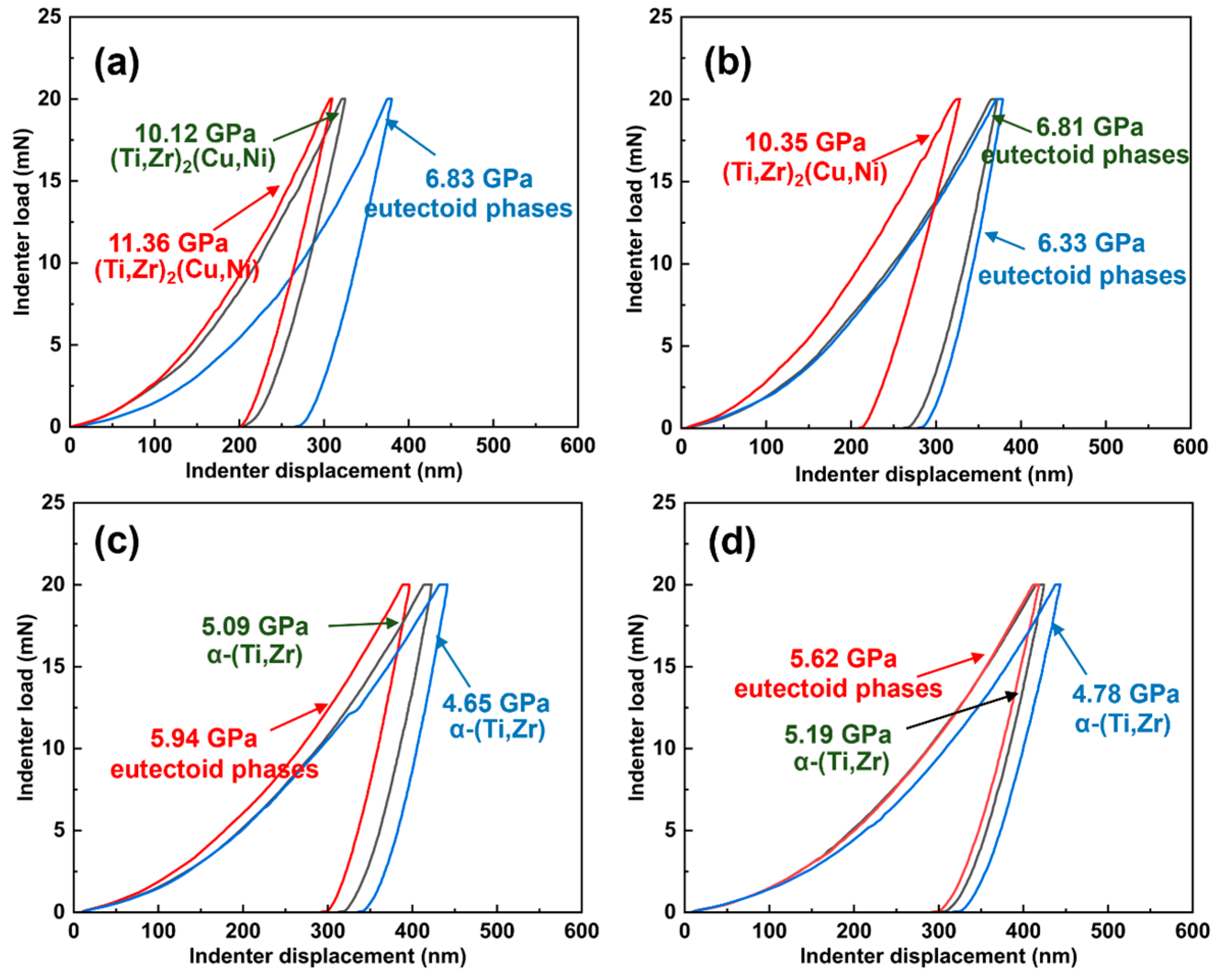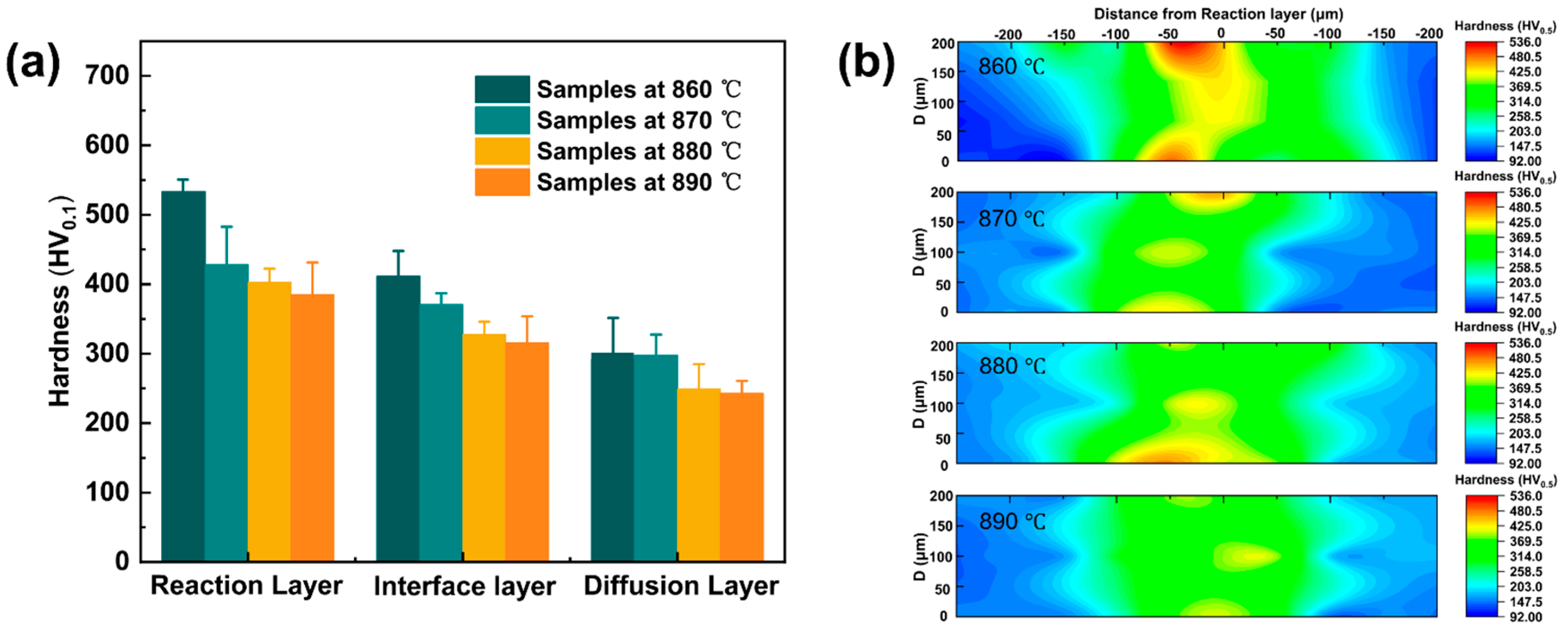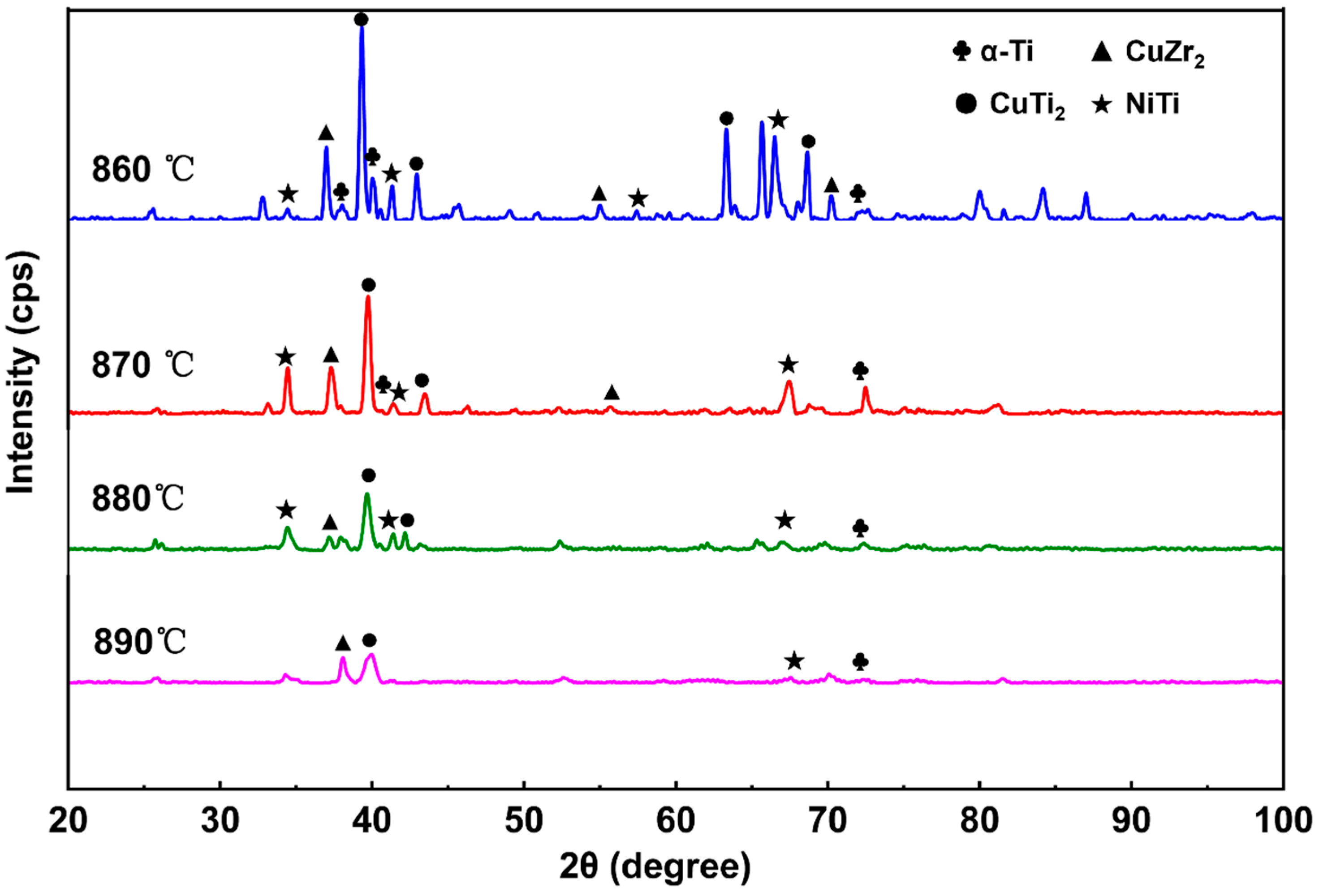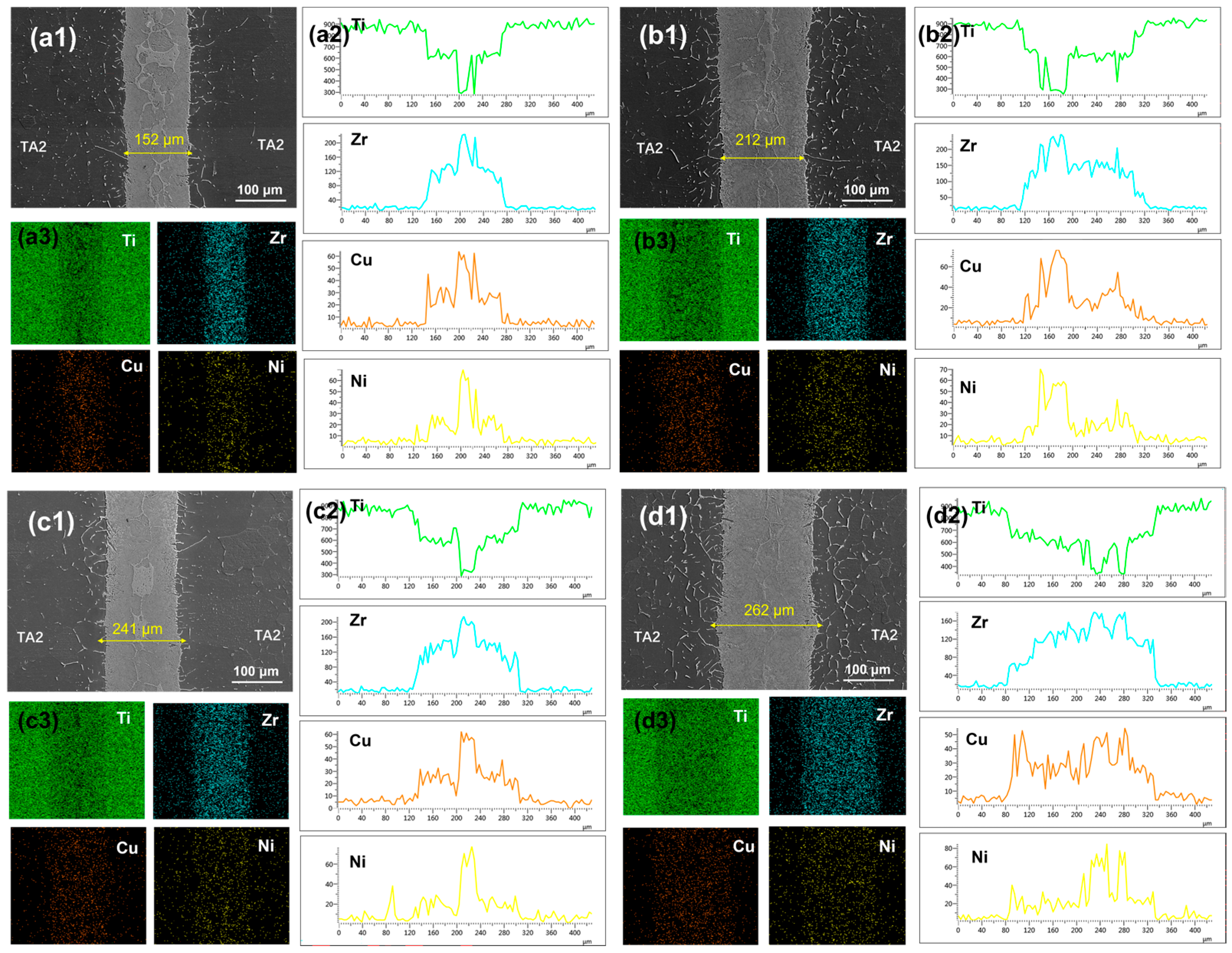 - With increasing brazing temperature, the seam microstructure evolved from residual filler and heterogeneous phases to a uniform structure characterized by smooth elemental distribution and gradual interfacial transition. The seam center was mainly composed of α-(Ti,Zr) solid solution, (Ti,Zr)2(Cu,Ni) intermetallic compounds, and lamellar eutectoid structures. At 890 °C, elemental diffusion was sufficient, and the microstructure transformed into an α-(Ti,Zr)-dominated solid solution with significantly improved homogeneity and stability.