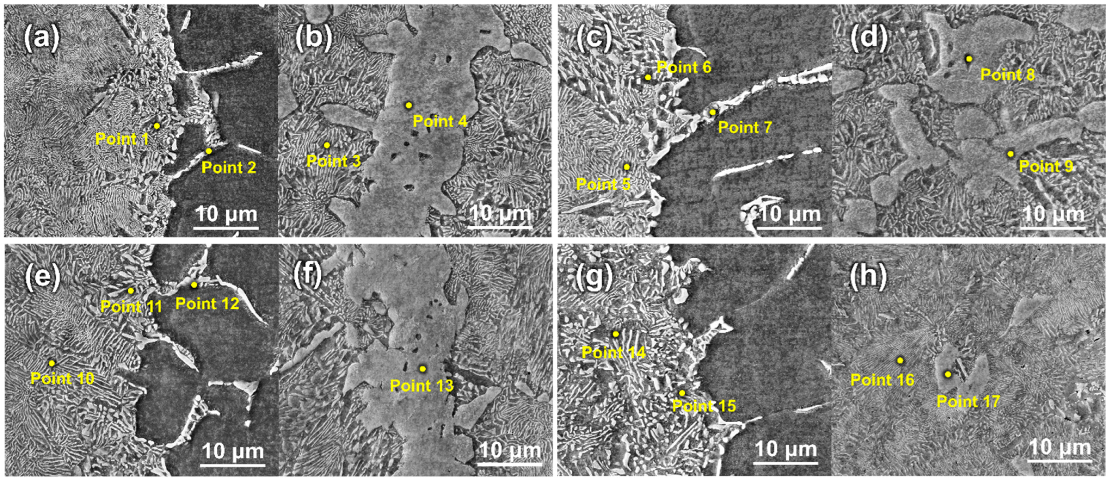 - Yang, J.W.; Liu, X.Y.; Li, T.; Chen, L.C.; Yang, K.; Ding, Z.Y.; Zhang, J.; Qiao, J. Effect of Ni interlayer on microstructures and mechanical properties of 2205 duplex stainless steel joint by laser oscillating welding. J. Iron Steel Res. Int. 2024, 31, 2463–2474. [Google Scholar] [CrossRef]