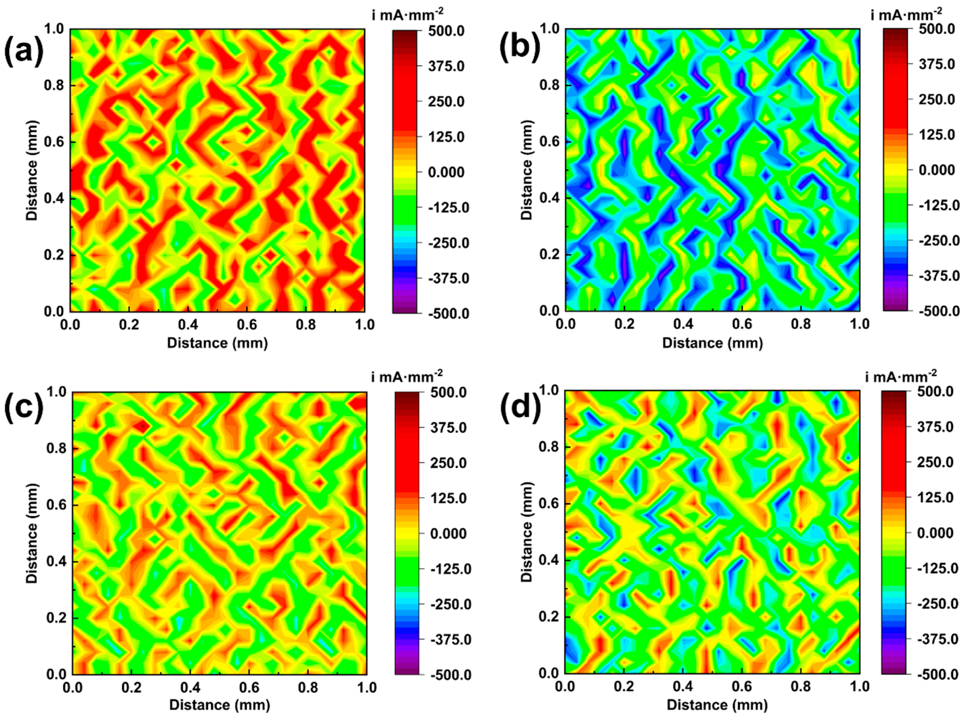 - Low-temperature joints exhibited strong anodic hotspots and pronounced micro-galvanic corrosion, mainly concentrated at α-(Ti,Zr)/IMCs phase boundaries. With increasing brazing temperature, both the number of hotspots and current density decreased, and at 890 °C, the current distribution became nearly uniform, demonstrating markedly improved corrosion resistance. The underlying mechanism was attributed to sufficient elemental diffusion and the formation of a protective TiO2–ZrO2 composite film at higher temperatures, which jointly mitigated electrochemical heterogeneity and enhanced interfacial stability.