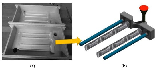 Test specimens were prepared with dimensions conforming to the ISO 6892-1:2009 standard for the measurement of ultimate tensile strength (UTS—Figure 2a). From one cast road, three tensile specimens (Figure 1b) were made.