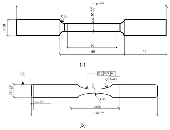 Dimensions of (a) a tensile specimen for mechanical tests, and (b) a test bars for fatigue tests.