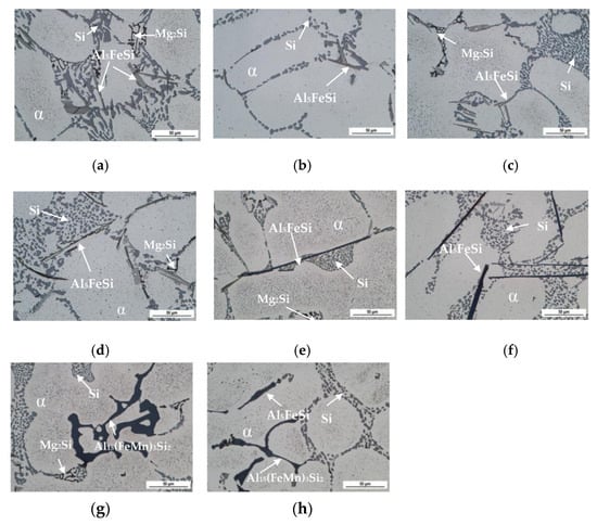 Microstructure of experimental materials, etch 0.5 HF (a) AC; (b) AC + T6; (c) 2Fe; (d) 2Fe + T6; (e) 3Fe; (f) 3Fe + T6; (g) 3Fe + Mn; (h) 3Fe + Mn + T6.